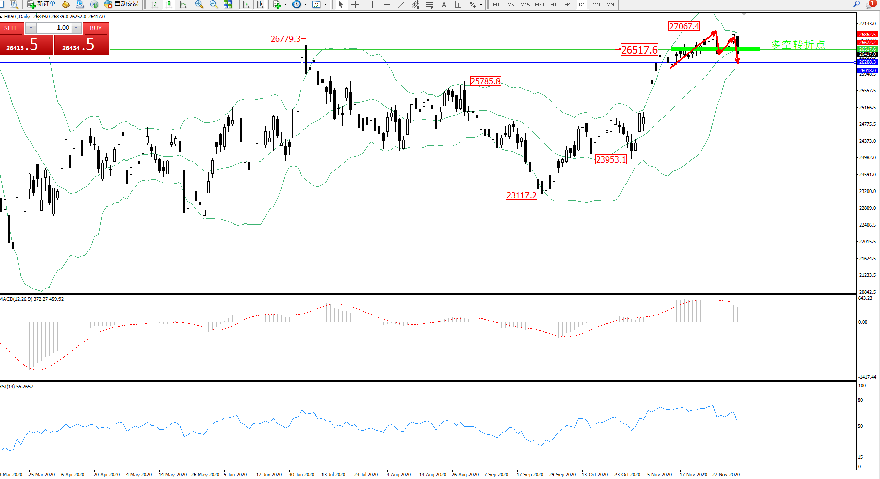 香港恒生指数12月7日(周一)收盘下跌329.07点,跌幅1.23%,报26506.85点;港股主要指数均收跌,恒指全天表现弱势,恒生科技指数跌0.1%。前期活跃的大金融股(银行、保险、中资券商股)全线下挫,拖累大市下跌。在线教育股普遍下跌;恒生科技股涨跌各半,光伏板块逆势爆发,表现最为亮眼,协鑫新能源飙涨超41%,保利协鑫能源大涨超24%;医药与半导体板块上扬,中芯国际收涨3.6%。今日南下资金净流入33.1亿港元,大市成交额为1352.74亿港元。当前港股市场对资金的吸引力已开始体现,明年伴随基本面向好,“新经济”投资标的增加,港股估值仍有抬升空间。新冠疫苗有机会面世、环球及中国经济复苏、财政刺激及极低利率等持续对资产价格构成支持,但MSCI香港指数自三季度至今反弹逾10%,已经体现不少利多因素,估值水平不算吸引。沪港AH溢价指数为过去10年较高水平。随着四季度以来成长股出现高位回落、风格有向价值股切换的迹象,股息率又较其他市场主要指数相对更高的港股,有望跟随经济复苏的脚步,越来越受到全球资金的青睐。