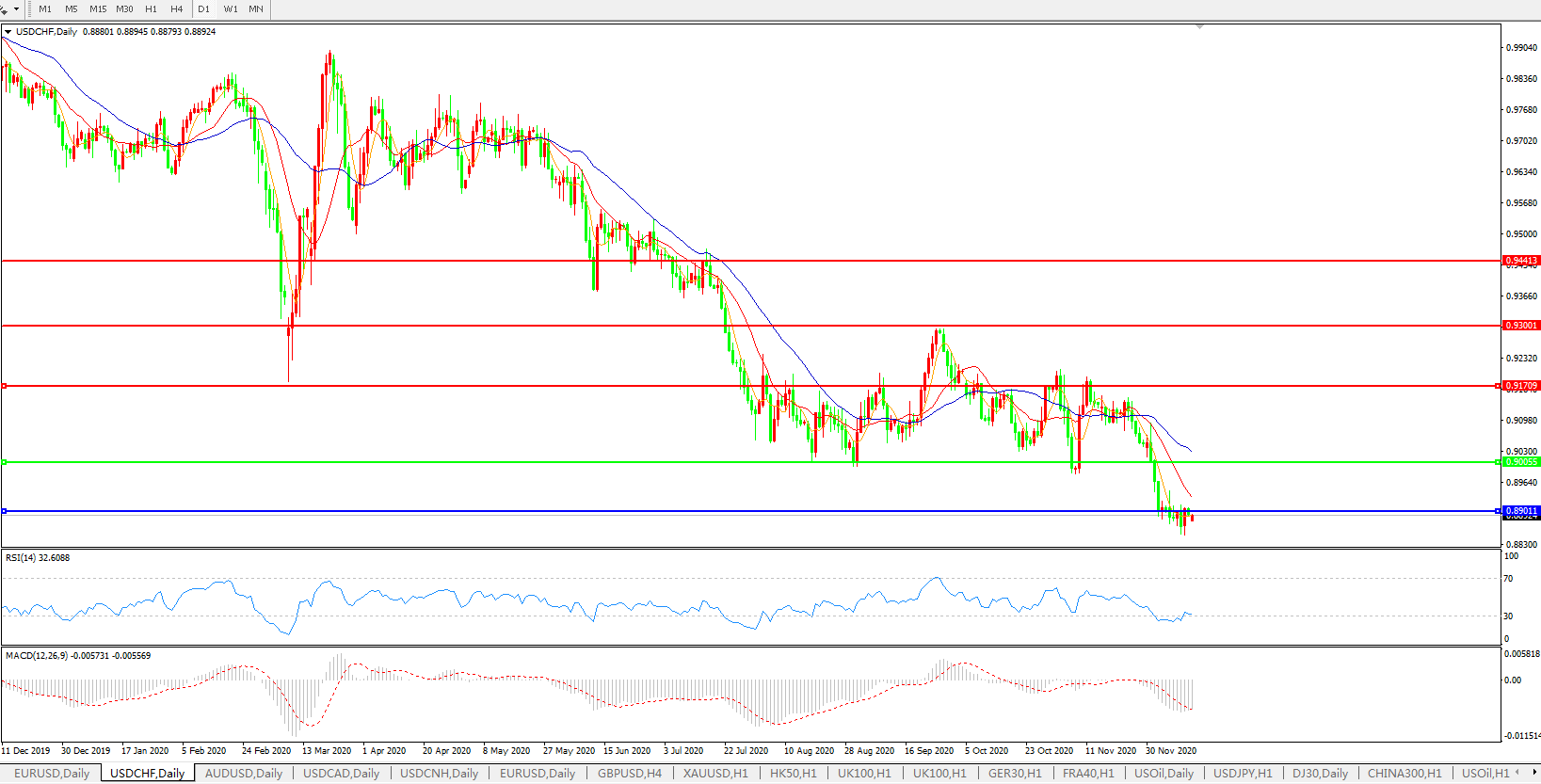 技术面简析:日线图均线发散下行,汇价低位弱势整理,MACD运行于0轴下方但量能开始缩量,RSI有走升迹象,预计短期汇价大概率将进行整理。