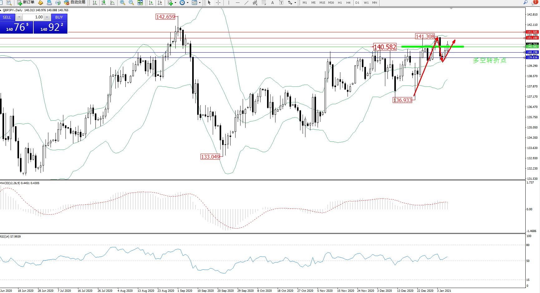 交易策略:140.582上方看涨,目标141.180、141.585