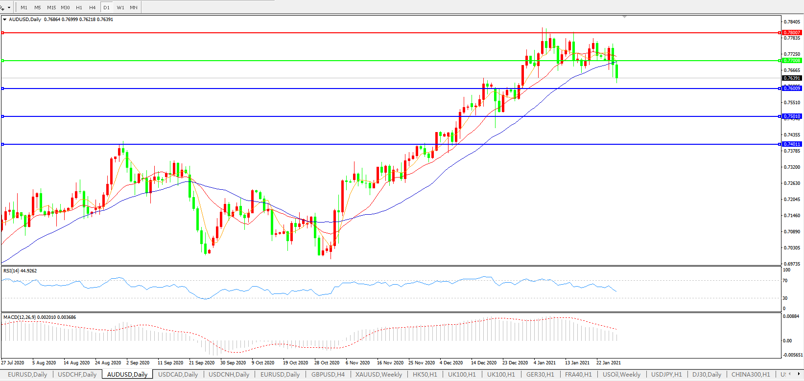交易策略:0.7700下方看跌,目标0.7600、0.7500