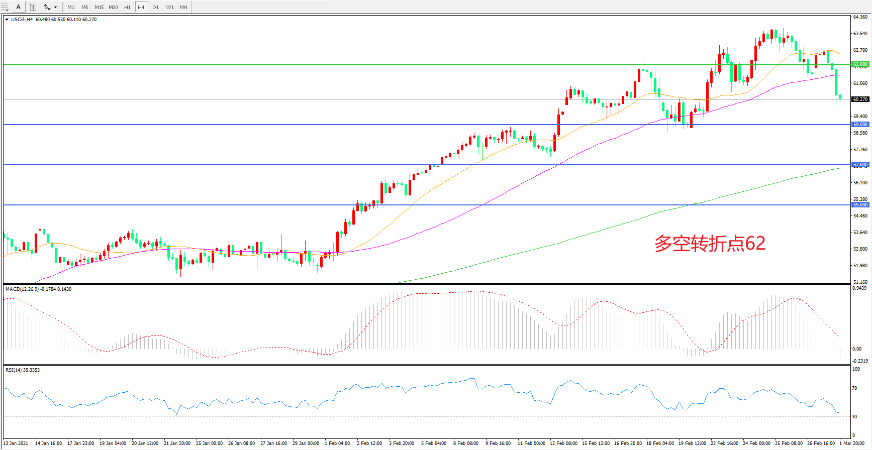周一(3月1日),市场突然传出消息,鉴于目前的油价表现,OPEC+可能从4月开始放宽对原油市场供应的限制,沙特也不会在3月过后继续自愿减产,美国WTI原油破位大跌,收报60.32美元/桶。如果本周OPEC+保持适度增产,市场可能会保持轻松上涨,如果各成员国增产意向明显,那么可能会削弱油价前景,引发市场获利回吐。