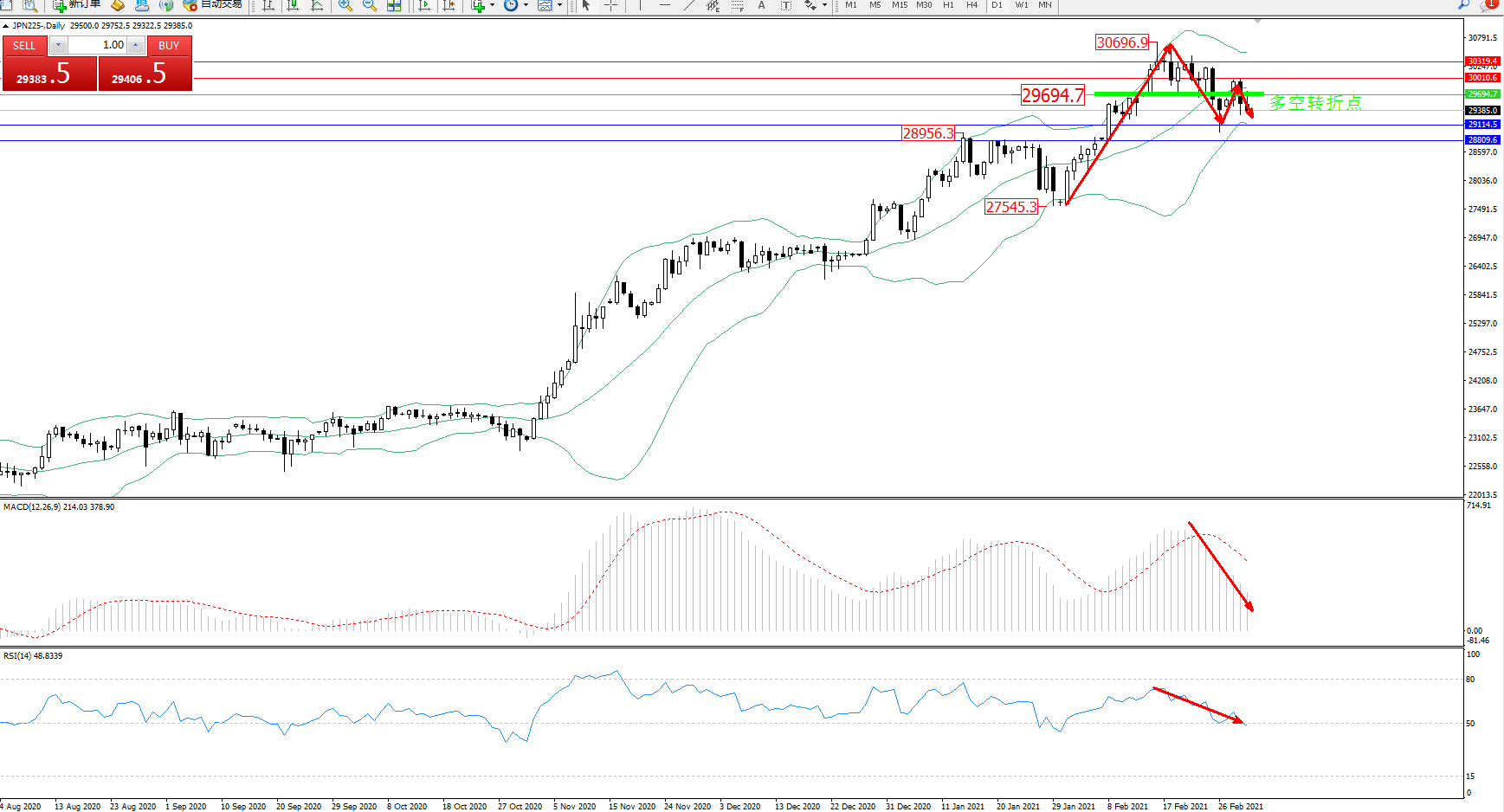 日经225指数3月3日(周三)收盘上涨161.83点,涨幅0.55%,报29570.00点。日本2月服务业活动连续第13个月萎缩,因抗疫限制举措打击企业活动,导致需求疲弱。东京及周边府县紧急状态将于周日结束。调查结果主要受新业务加速下滑以及出口业务持续萎缩所致。该数据1月终值为46.1,2月初值为45.8。在疫情的拖累下,需求仍然脆弱。随着开始接种疫苗,短期不确定性似乎已见缓和。企业看来在为需求上升做准备,去年2月以来首次扩大就业水平。调查中的展望指数也见乐观情绪,展望指数显示企业对未来12个月的乐观看法是2018年1月以来最高。东京地区目前将于3月7日到期的新冠疫情防控紧急状态可能需要再延长两周,因菅义伟寻求进一步遏制病毒传播的速度。在与专家和当地领导人协商后,将做出最终决定。东京都知事小池百合子以及首都圈三个人口最大县的知事均敦促将紧急状态延长两周,以遏制病毒感染。