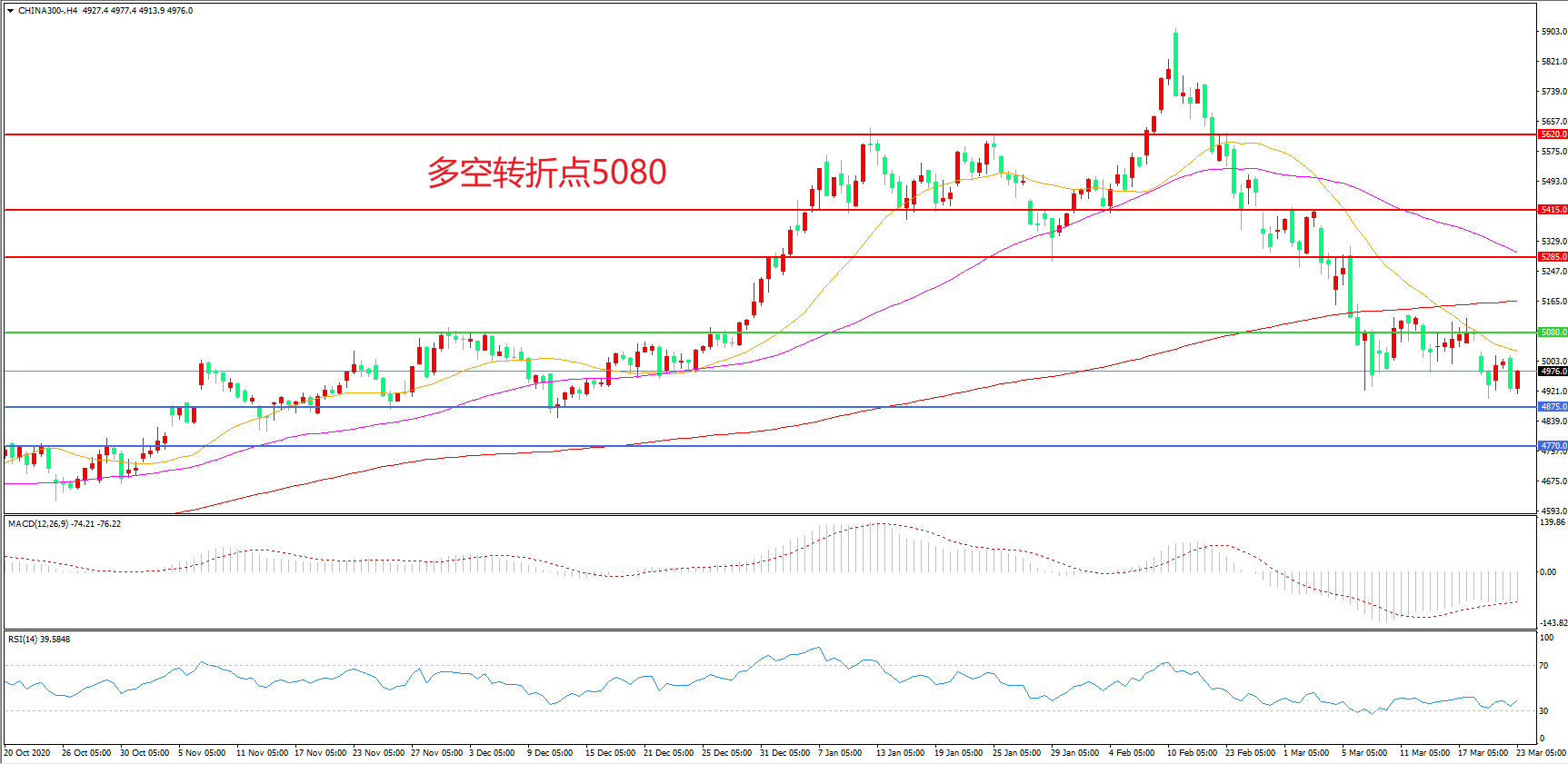 4小时图看,沪深300低位震荡企稳,21周期均线成为上方阻力,4875成为下方支撑,MACD绿柱缩短,RSI指标走平,日内延续震荡概率较大。