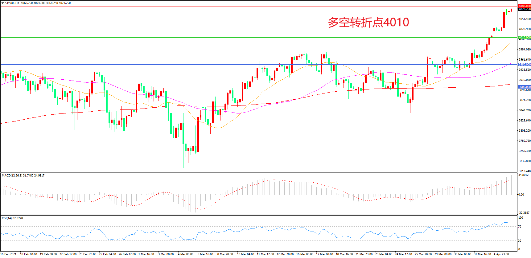 周一(4月5日),继3月美国非农就业增长数据后,3月ISM服务业指数也远超预期,并创历史新高,意外强劲的经济数据助长了投资者对经济复苏的信心,标普再度大幅拉升,收报4070点,创下历史新高。大型科技股中,谷歌涨超4%领跑,苹果、微软、亚马逊涨超2%。
