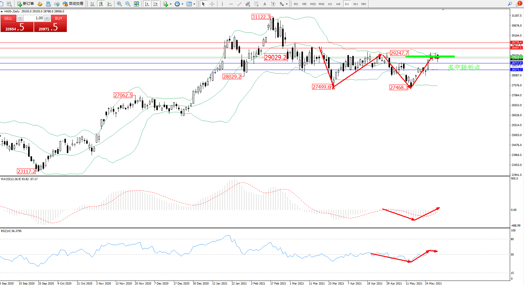 香港恒生指数5月31日(周一)收盘上涨27.39点,涨幅0.09%,报29151.8点;港股三大指数午后拉升,恒指尾盘转涨。恒生科技指数涨1.84%报8104点。生物医药股全线大涨,康方生物等多股创历史新高;大型科技股美团持续拉升,大幅收涨近11%,网易涨超4%,腾讯涨3%,小米涨超2%;午后受三孩生育政策刺激,好孩子国际暴涨超30%,受疫情影响的航空股、石油股、濠赌股全天疲弱。今日大市成交额为1522亿港元,南下资金净流入15.33亿港元。南下资金今日净卖出9.48亿港元。中国移动、友邦保险、中国飞鹤分别遭净卖出8.54亿港元、3.17亿港元、2.68亿港元。净买入方面,美团-W、腾讯控股、思摩尔国际分别获净买入14.37亿港元、7.9亿港元、4.63亿港元。香港特区政府卫生署卫生防护中心31日公布,截至当日零时零分,香港新增4例输入性新冠肺炎确诊病例。截止到目前,香港累计新冠肺炎确诊病例11841例。香港特区政府:《2021年收入(印花税)条例草案》的二读辩论将恢复。法案若获得议员支持及通过二读,将会交付全体委员会。法案经全体委员会审议后,若全体委员会的报告获立法会采纳,法案将进行三读。