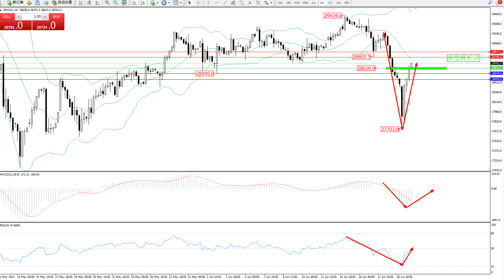 技术点评:空头动力延续布林带指标下轨附近节点,持续震荡下行,低位跌破布林带指标下轨后抵达27703位置附近得到支撑强势回升,即将触及中轨附近节点,低位多头动力反转拉升走势短期或将持续,布林带指标呈张口走势后开始收口中,MACD指标处于0轴线下方空头区域维持震荡有缓慢回升迹象,RSI指标处于空头区域低位震荡反手上扬,即将触及50均衡线附近节点;