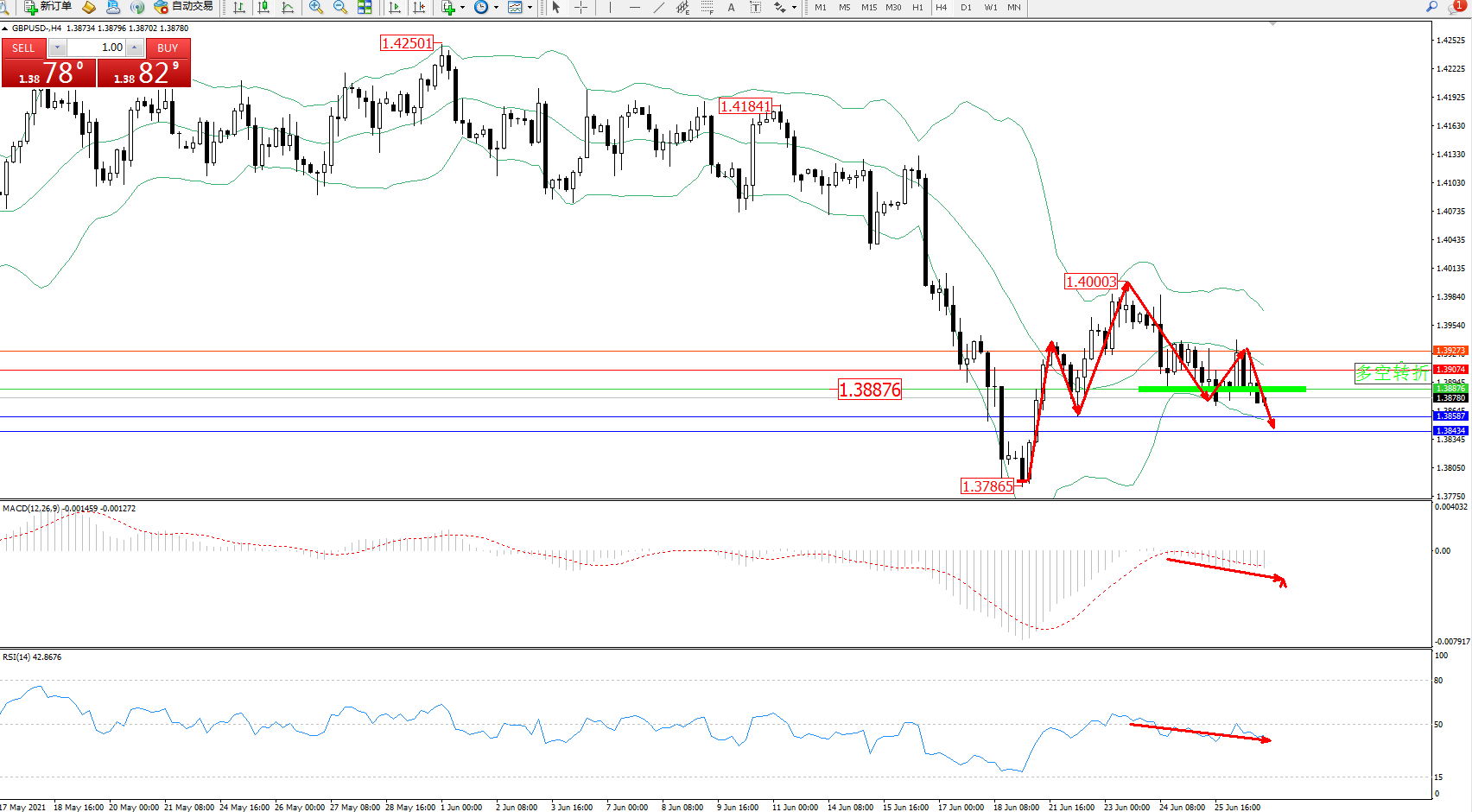 交易策略:1.38876下方看跌,目标1.38587、1.38434