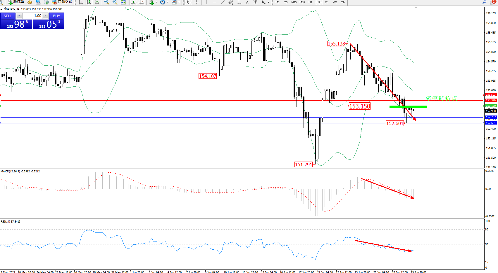 技术点评:高位空头动力延续布林带指标通道中下轨区间持续震荡下行,低位抵达152.601位置后短暂震荡回升,空头动力下行趋势走势态势良好,短期未见最终止步迹象,布林带指标呈下行趋势走势持续中,跌势未见止步,MACD指标处于0轴线下方空头区域维持弱势不断下行中,RSI指标处于50均衡线下方空头区域维持窄幅整理平移中;