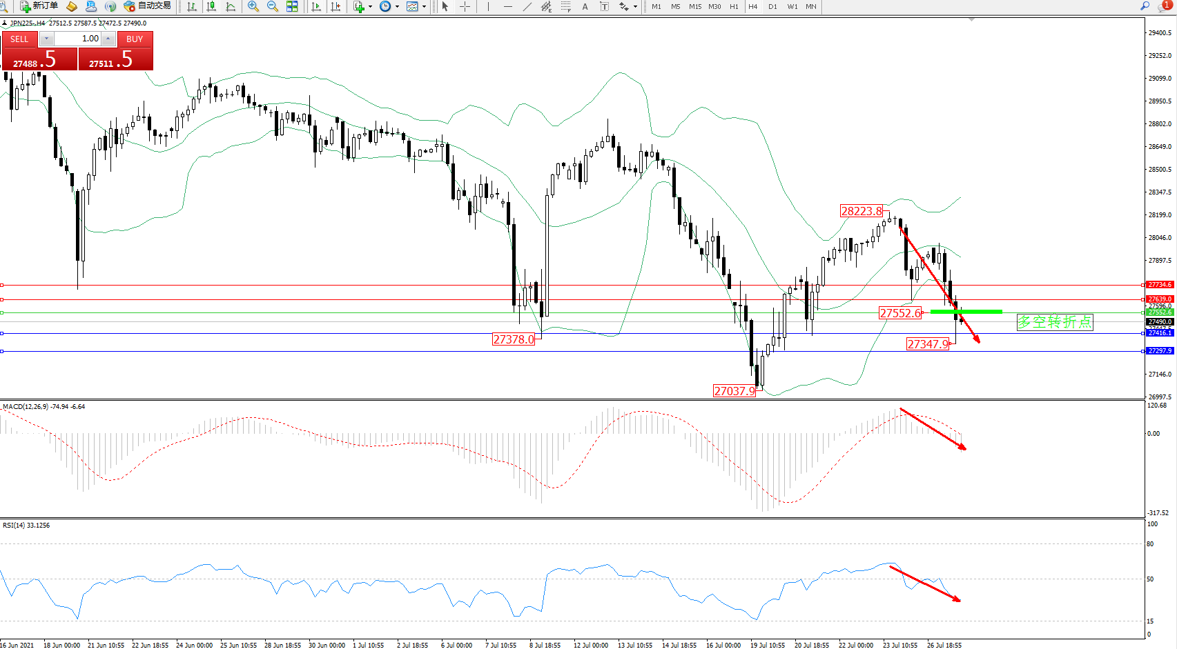 技术点评:空头动力呈阶梯式震荡下挫,跌破布林带指标下轨至27347位置后得到短暂支撑开始震荡,布林带指标呈张口走势持续中,跌势下行走势未见最终止步迹象,MACD指标处于0轴线下方空头区域维持震荡向下移动中,RSI指标处于50均衡线下方空头区域不断下移中;