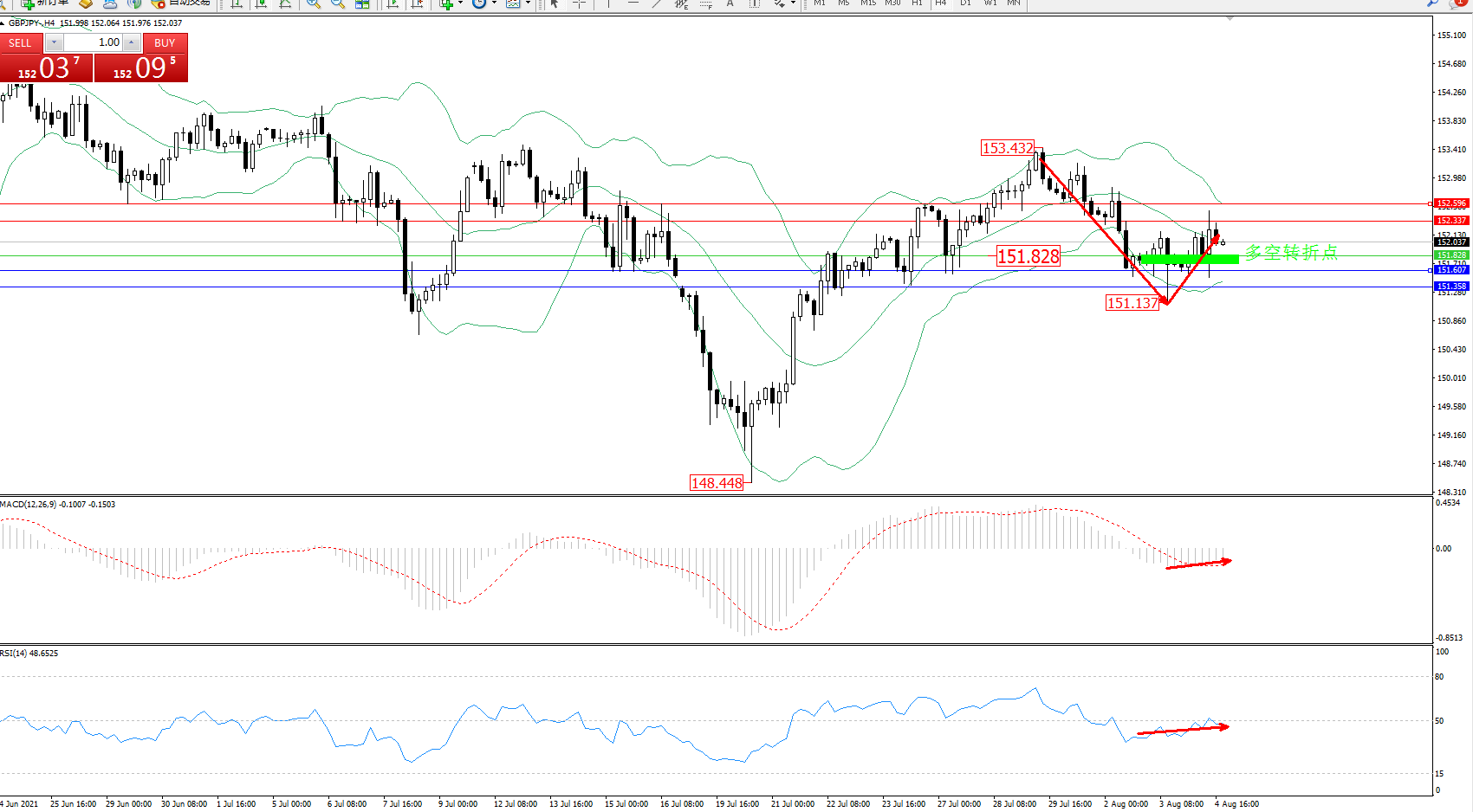 备选策略:151.828下方看跌,目标151.607、151.358