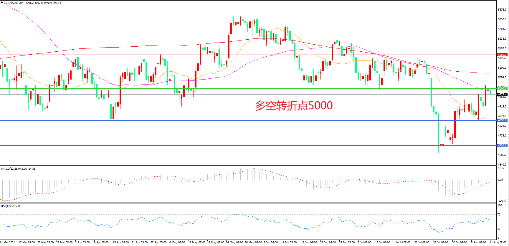 4小时图看,沪深300大幅反弹后受阻于5000点附近阻力,上行势头受阻,断区均线拐头向上,MACD红柱增加,日内内能突破上方阻力,有望再次迎来拉升。