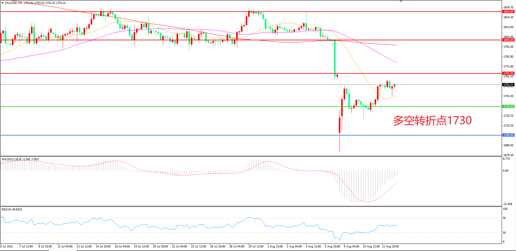 周四(8月12日),7月PPI超预期增长,刷新同比增速最高纪录,现货黄金延续回补缺口后的窄幅震荡,收报1752.85美元/盎司。此前突如其来的数亿美元抛单导致黄金价格大幅下挫,所幸的是,抄底资金入场拯救了金价大跌颓势,但近期美国数据的靓丽表现依然让多头心有疑虑,因为如果美联储缩减宽松的措施临近,黄金仍面临着较大的压力。