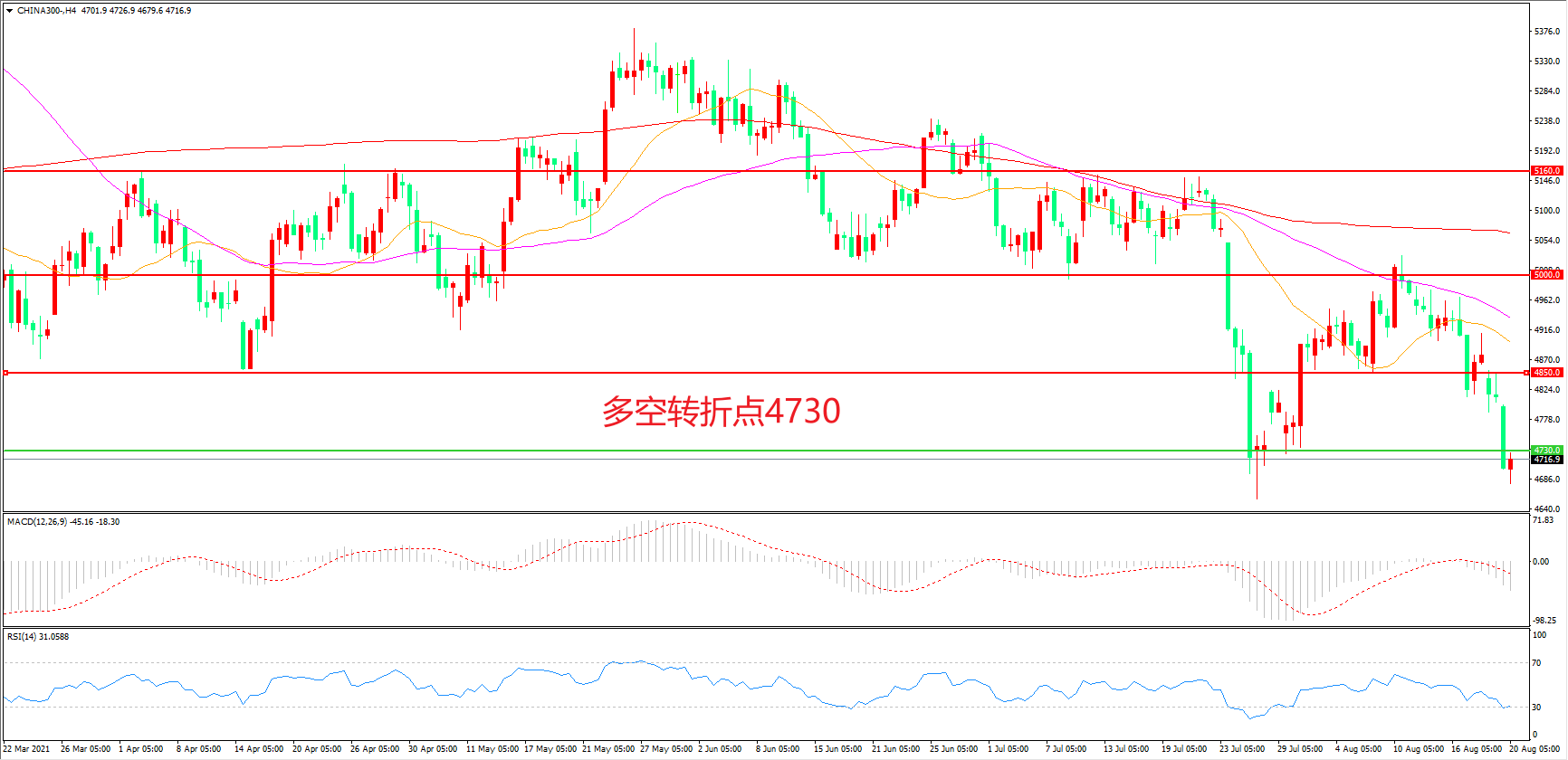 4小时图看,沪深300受制于均线系统阻力,下行趋势较为明显,4730成为短期多空分水岭,MACD绿柱增加,RSI指标走平,日内震荡下行概率较大。