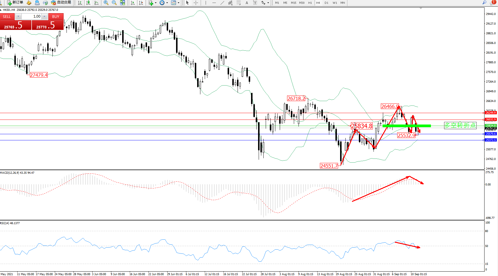 技术点评:多头动力延续布林带指标通道中上轨区间持续震荡上扬,高位抵达26466位置后遇阻回撤,纠结于中下轨区间震荡,短期有急速回撤迹象,布林带指标呈上行趋势拉升后开始收口,MACD指标处于多头区域维持整理缓慢下移,RSI指标处于多头区域持续震荡回撤,纠结于50均衡线附近来回整理;