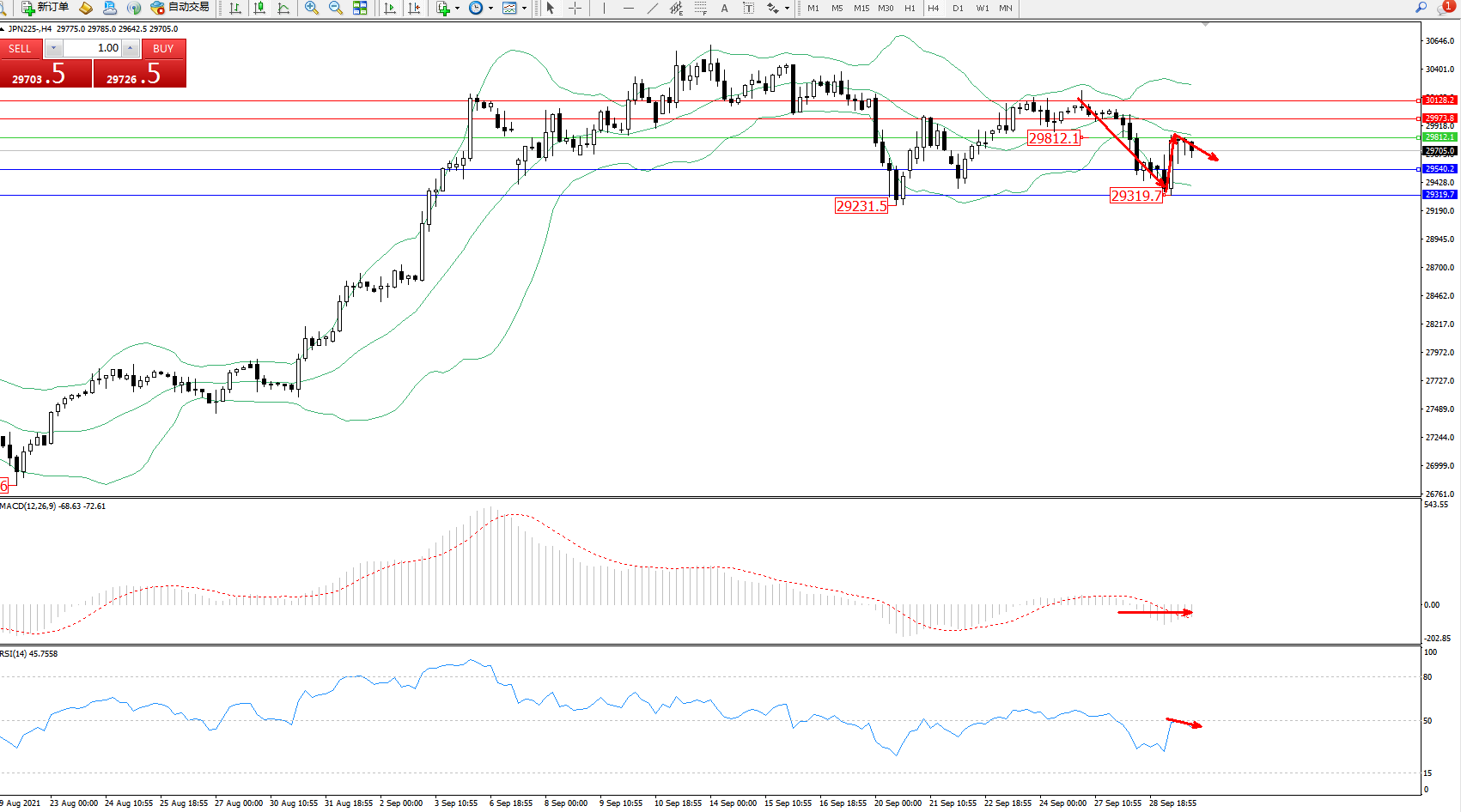 日经指数JPN225——4小时K线图显示: