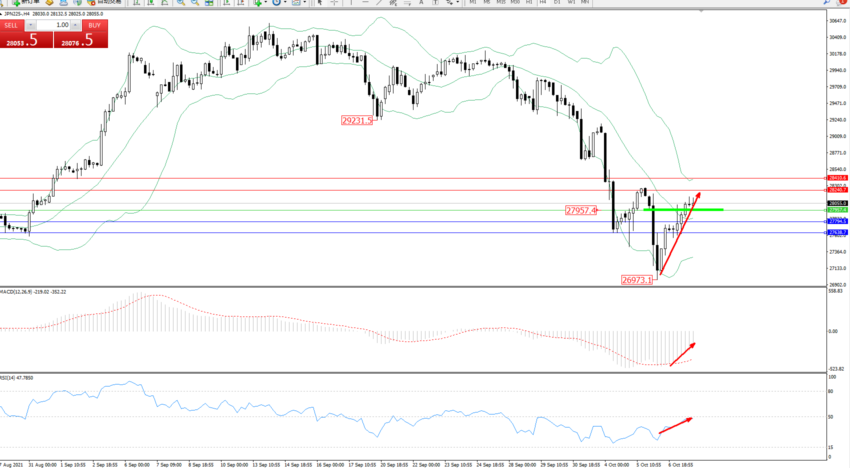 技术点评:空头动力延续布林带指标通道中下轨区间吃震荡下行,低位抵达26973位置后得到支撑拉升上扬,纠结于布林带指标中上轨区间整理,短期多头动力有继续拉升态势,布林带指标呈收口走势持续中,MACD指标处于空头区域维持整理持续上移中,RSI指标处于空头区域维持整理上移,即将触及50均衡线附近节点;