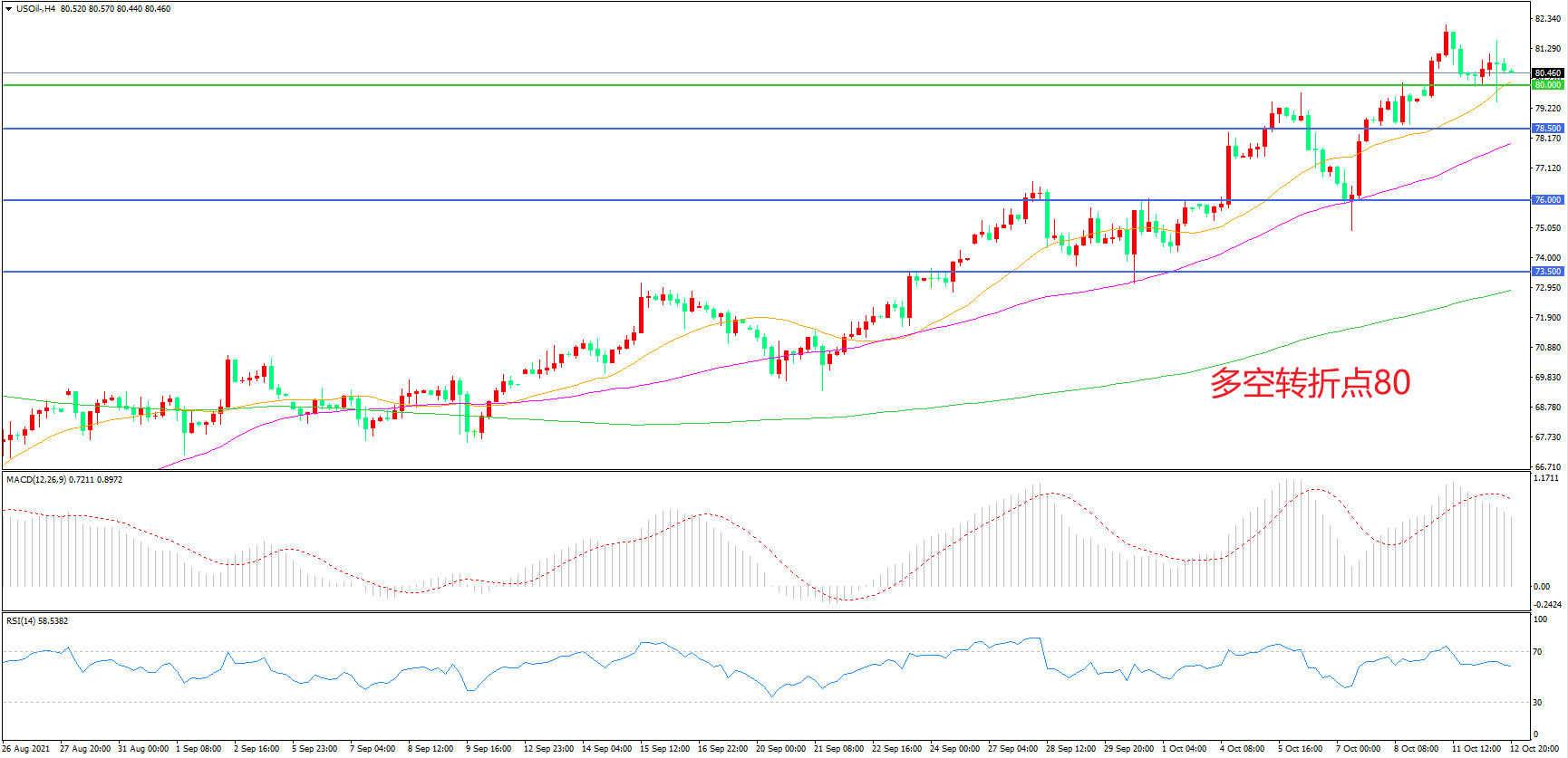 周二(10月12日),随着全球能源危机的阴霾持续扩散,市场对冬季能源短缺的担忧加剧,,各投行纷纷预测油价将升至90关口,美国WTI原油延续强势表现,收报80.45美元/盎司。目前最大的变数来自美国,拜登政府此前已经呼吁沙特阿拉伯及其盟友国向全球市场提供更多原油,如果油价继续飙升,美国可能会要求OPCE成员国增加原油产量,以减缓石油价格的飙升速度。