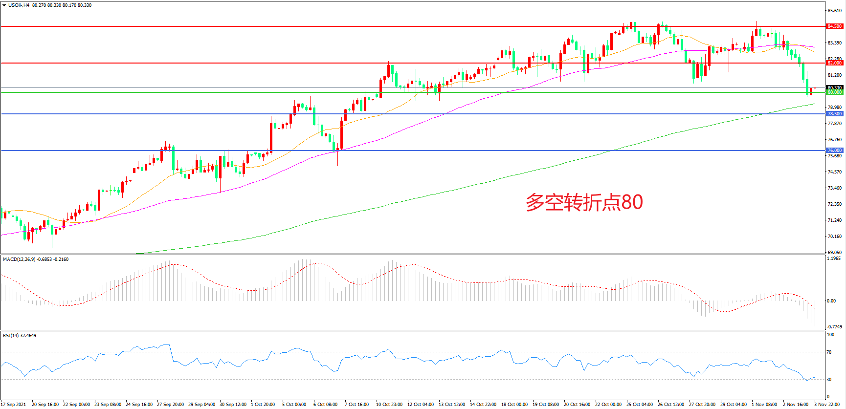 周三(11月3日),根据美国能源信息署公布的数据显示,虽然美国汽油库存降至2017年11月份以来新低,但原油库存意外增加 329 万桶,连续六周高于预期,糟糕的数据引发了市场的恐慌情绪, 美国WTI原油破位下行,收报80.19元/桶。目前市场还在等待OPEC大会的最终结果,是否坚持每月增加40万桶的增产计划成为市场最关心的问题。