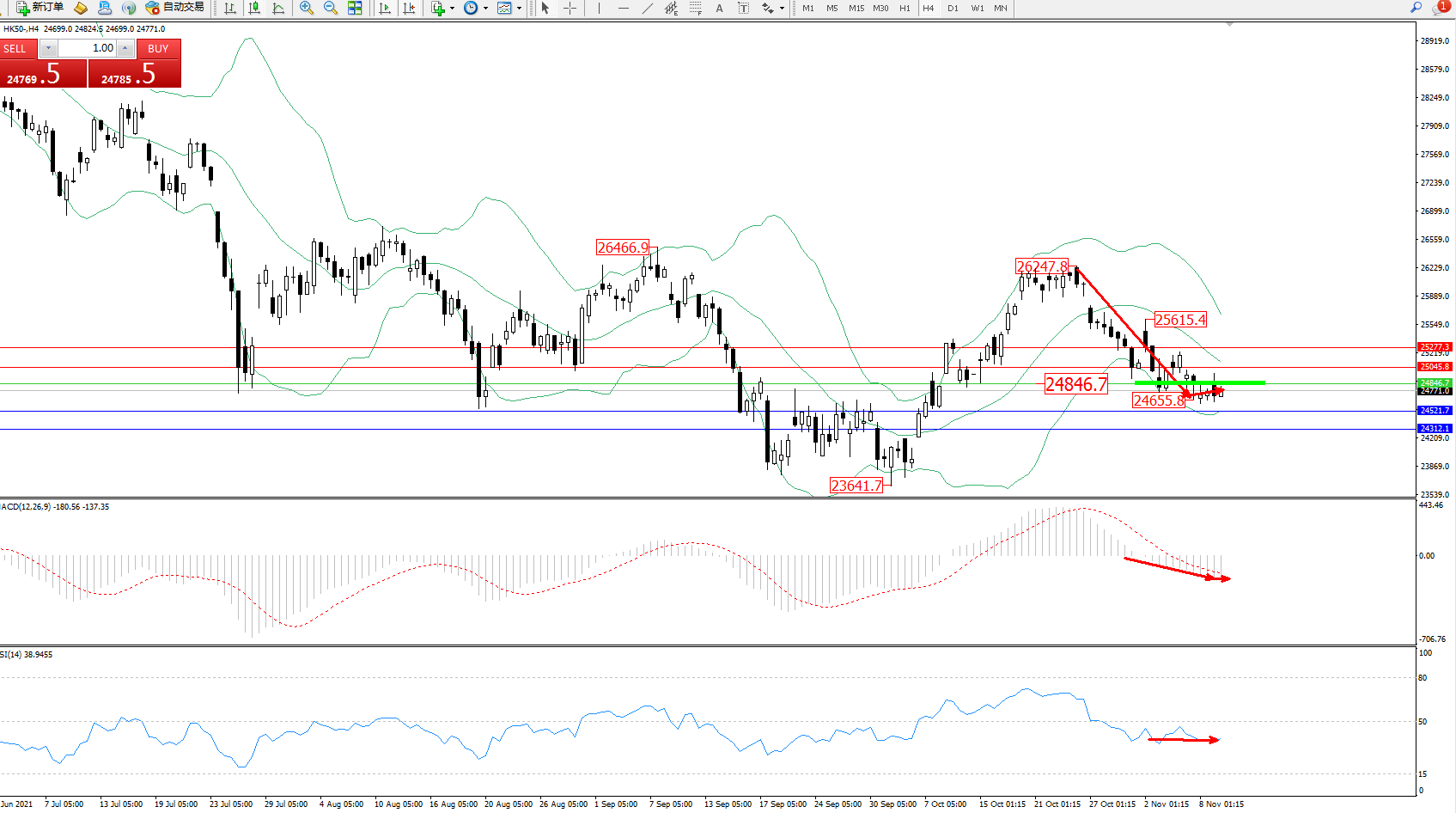 技术点评:空头动力延续布林带指标通道中下轨区间持续震荡下行,低位抵达24655位置后开始整理平移,短期空头开始减弱,但整体下行迹象依旧,布林带指标呈下行趋势走势后开始有收口迹象,MACD指标处于0轴线下方空头区域维持整理平移,RSI指标处于50均衡线下方空头区域持续徘徊中;