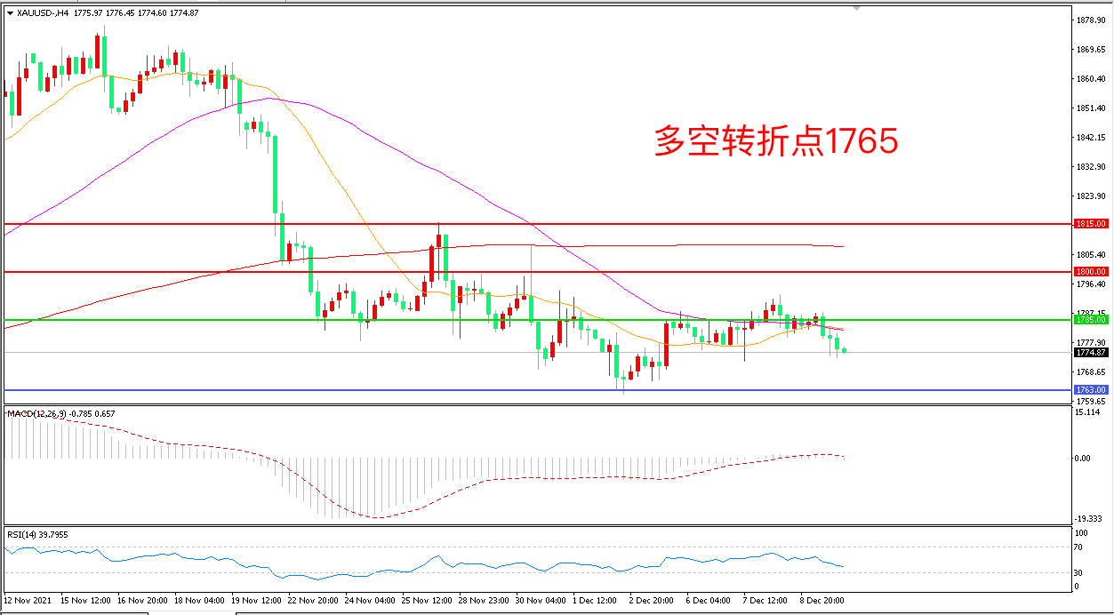 4小时图看,金价高点逐渐降低,短期表现疲软,均线系统形成上方压力,1785成为多空分水岭,MACD绿柱缩短,RSI指标走平,日内震荡下行概率较大。