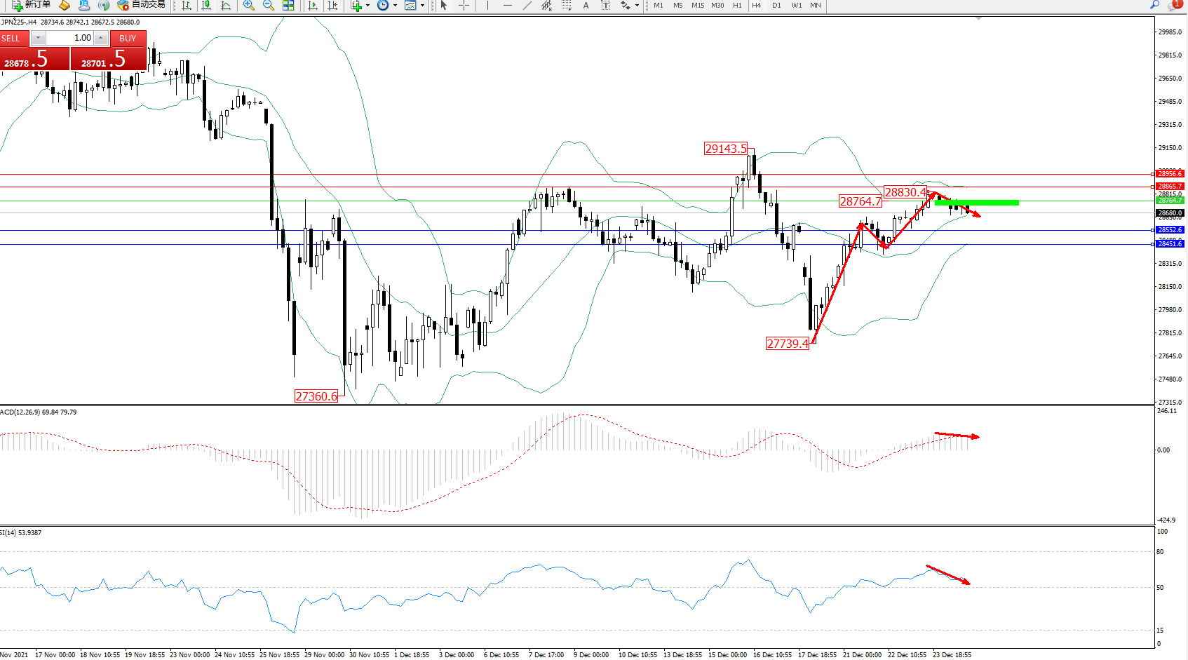 技术点评:多头动力延续布林带指标通道中上轨区间持续上扬,高位抵达28830附近遇阻整理回撤,短期空头动力有伺机入场迹象,布林带指标呈收口走势中,MACD指标处于多头区域维持整理平移,RSI指标处于多头区域持续震荡回撤,即将触及50均衡线附近节点;