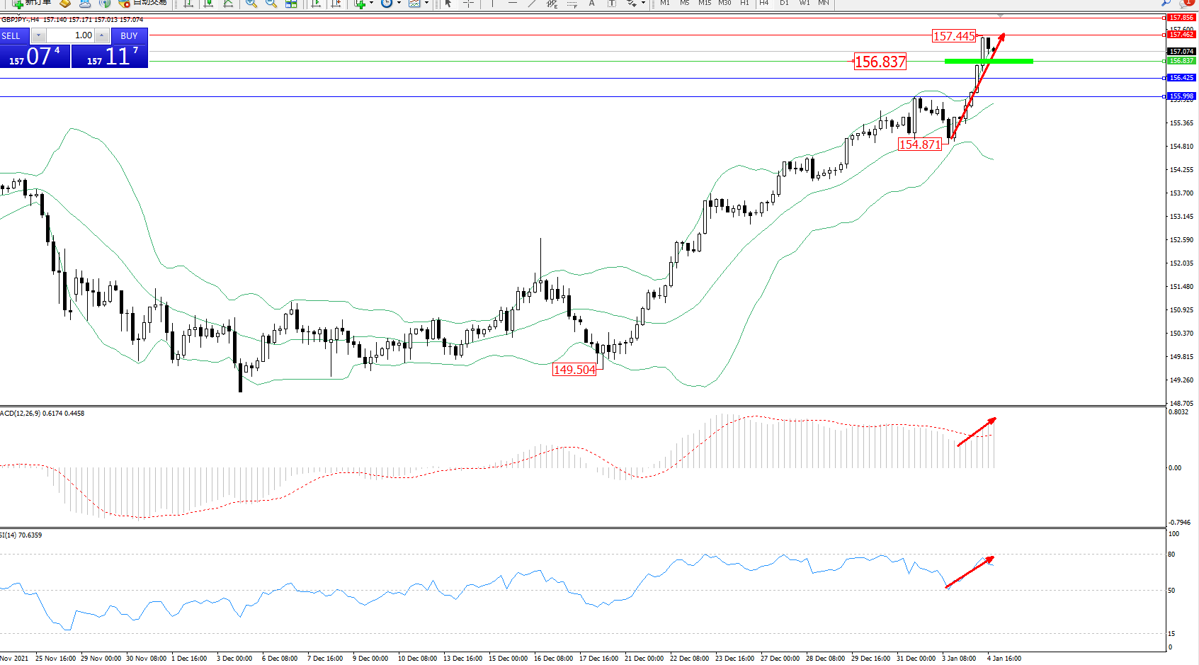 技术点评:多头动力延续布林带指标上轨附近持续震荡上扬,高位抵达157.445位置后短期整理,多头动力依据有继续攀升态势,布林带指标呈张口走势态势良好,MACD指标处于多头区域持续震荡上扬,RSI指标多头动力维持震荡上移走势持续中;