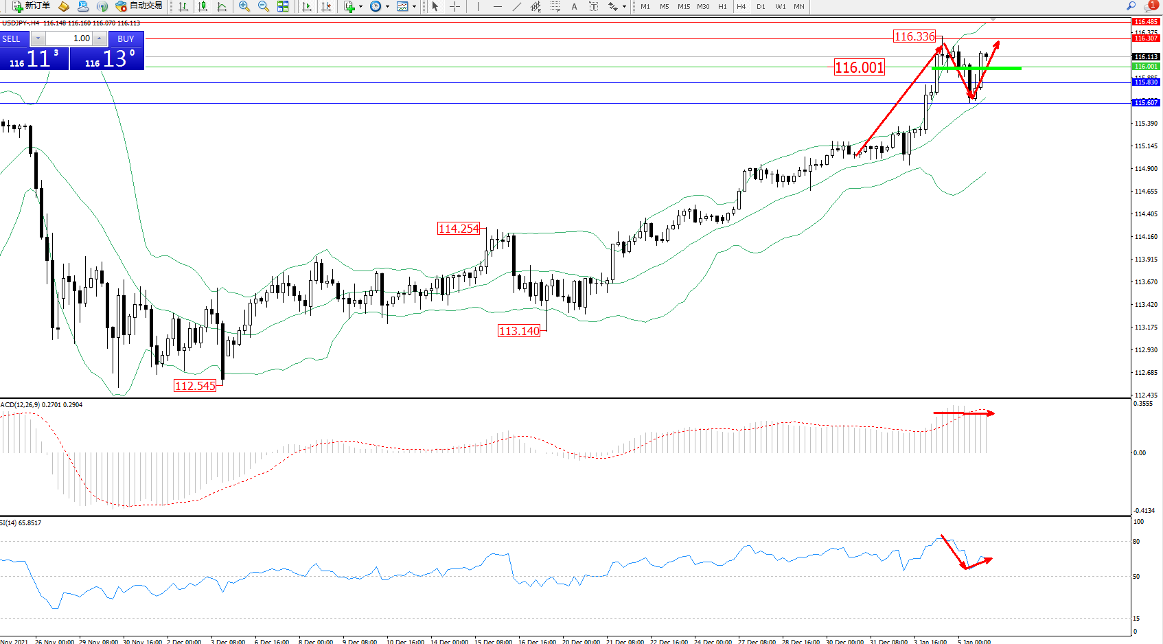 技术点评:多头动力延续布林带指标通道中上轨区间持续震荡上扬,高位抵达116.336位置后遇阻回撤,短期空头动力伺机入场震荡,即将触及布林带指标中轨附近节点后多头动力再度上扬,布林带指标呈上行趋势拉升,高位张口后开始收口上扬,MACD指标出多头区域高位持续震荡平移,RSI指标高位空头动力伺机入场下行后,V型反转上移;