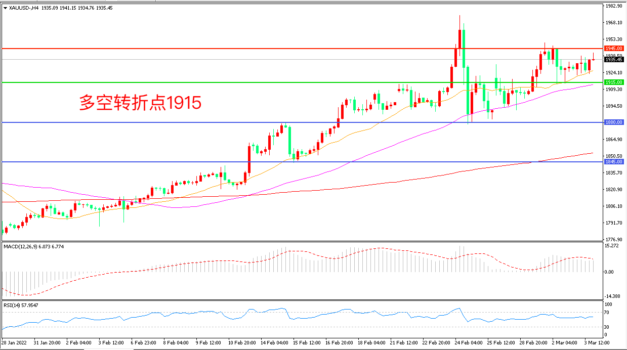 周四(3月3日),俄乌双方边打边谈,鲍威尔发出鹰派表态,多重因素影响下,市场波幅较狭,现货黄金窄幅震荡后,收报1935.45美元/盎司。今晚市场将迎来最重磅的非农就业数据,如果非农数据表现强劲,将强化美联储近期的加息预期,强势美元会对未来金价形成影响,务必重点关注。