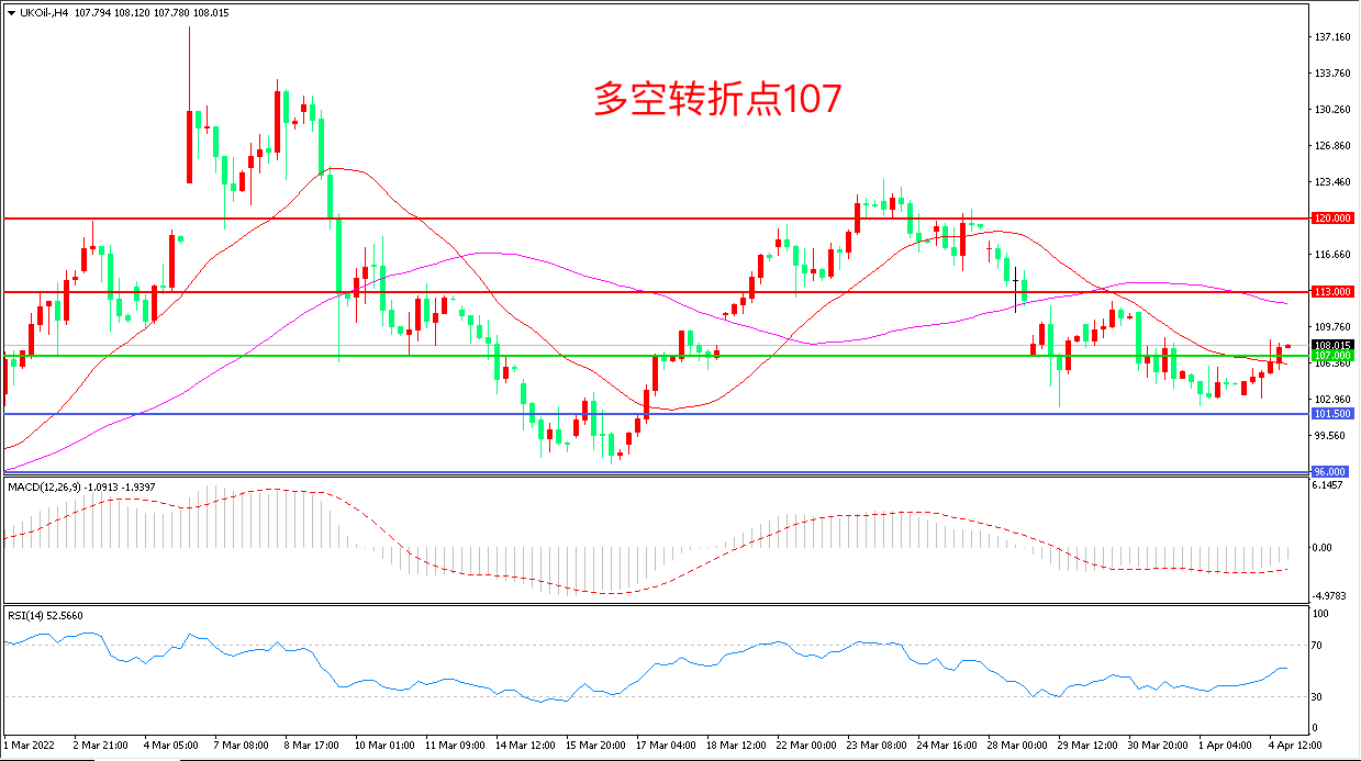 4小时图看,油价回踩101.5一线后再度拉升,短线走势回暖,55周期均线成为阻力,107美元成为多空分水岭,MACD绿柱缩短,RSI指标走平,日内延续震荡概率较大。