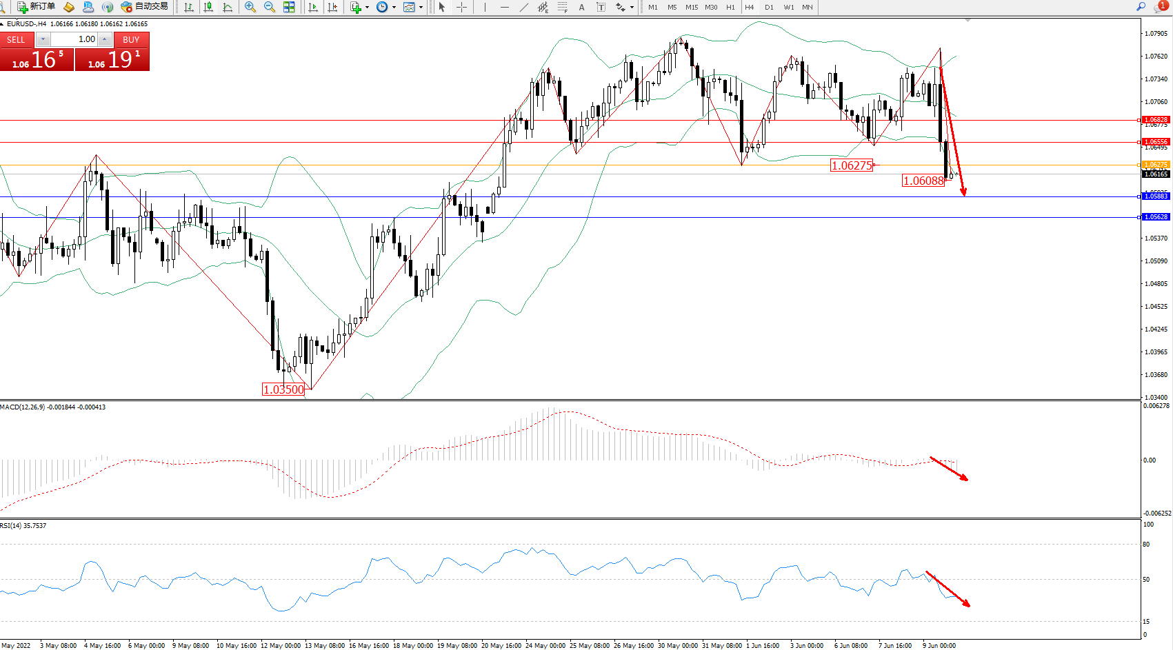 交易策略:1.06275下方看跌,目标1.05883、1.05628