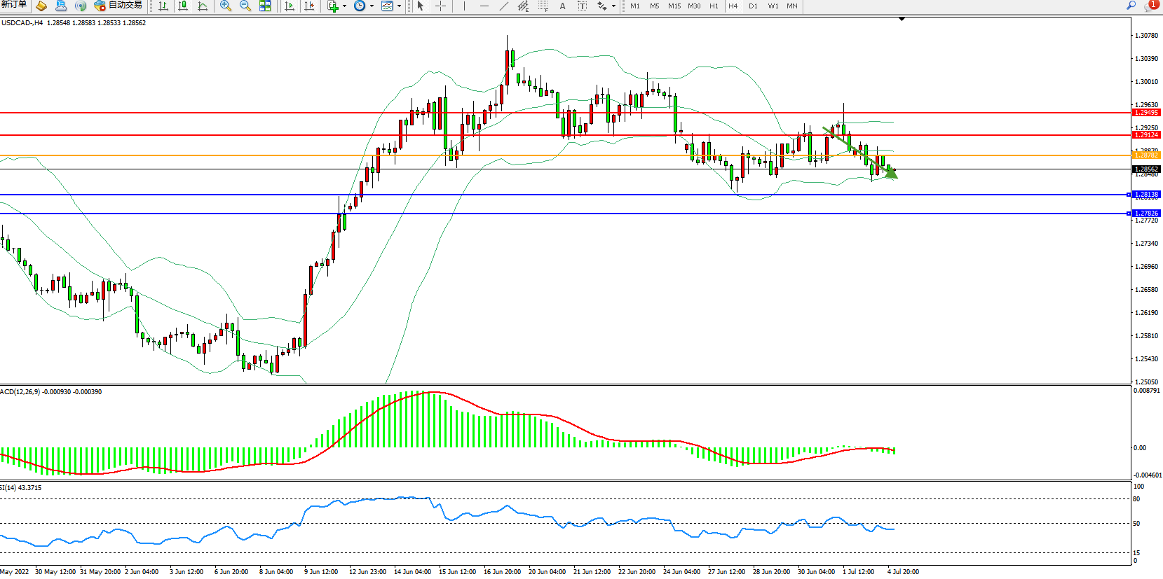 4小时图看:长时间维持布林带指标通道内宽幅震荡,布林带指标呈收口平移中,MACD指标处于0轴线下侧弱势徘徊,RSI处于50均衡线下侧窄幅整理;