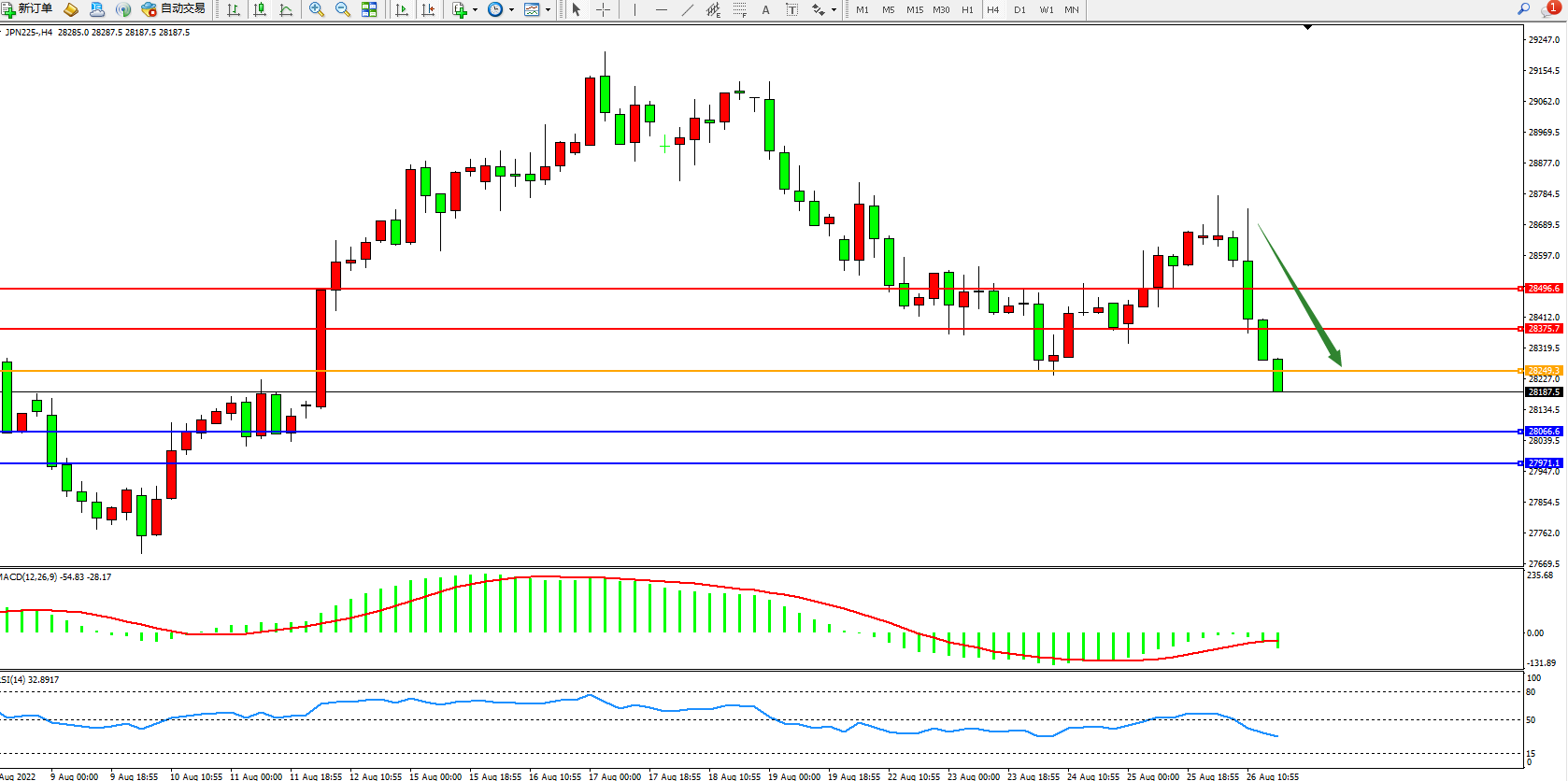 日经225指数8月26日(周五)收盘上涨156.49点,涨幅0.55%,报28635.50点。路透调查显示,日本2022财年GDP增速为1.7%,2023财年为1.3%(7月份调查分别为1.9%和1.6%)。2022财年核心CPI预计增长2.3%,2023财年增长1.1%(7月份调查分别为2.1%和1.1%)。