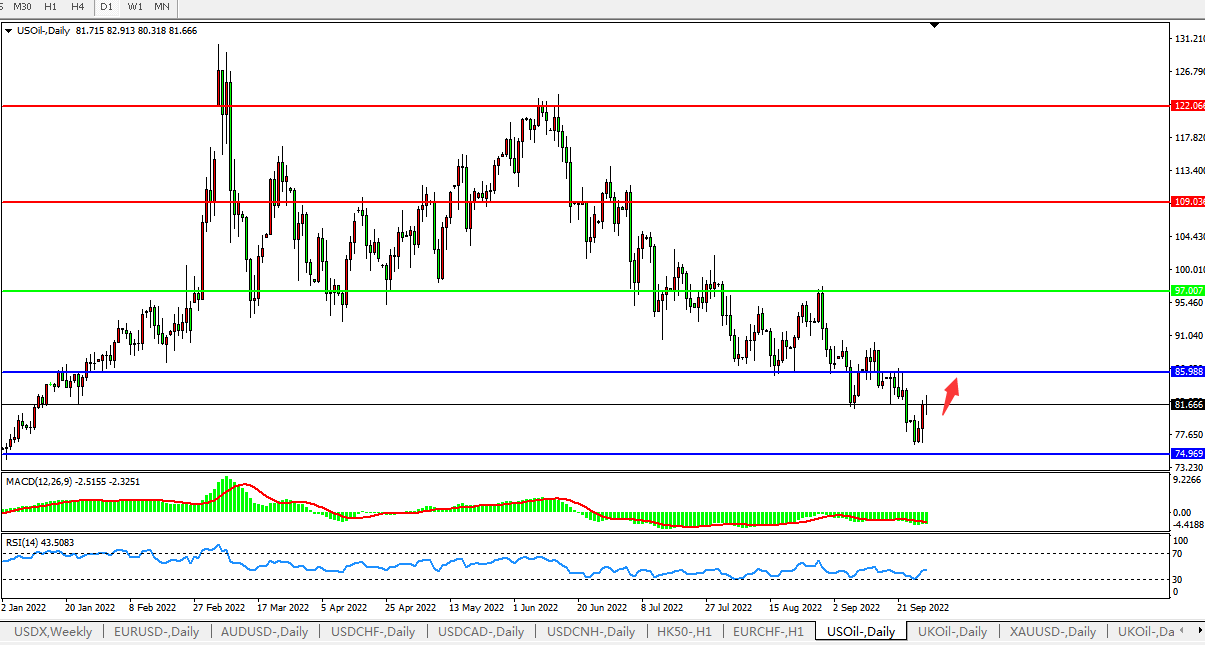 日线图看:油价继续小幅拉升, MACD量能柱0轴下方开始缩量,RSI指标小幅走强,短期油价继续反弹概率增大。