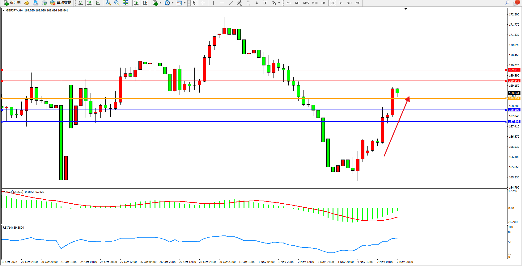 交易策略:168.597上方看涨,目标169.348、169.810