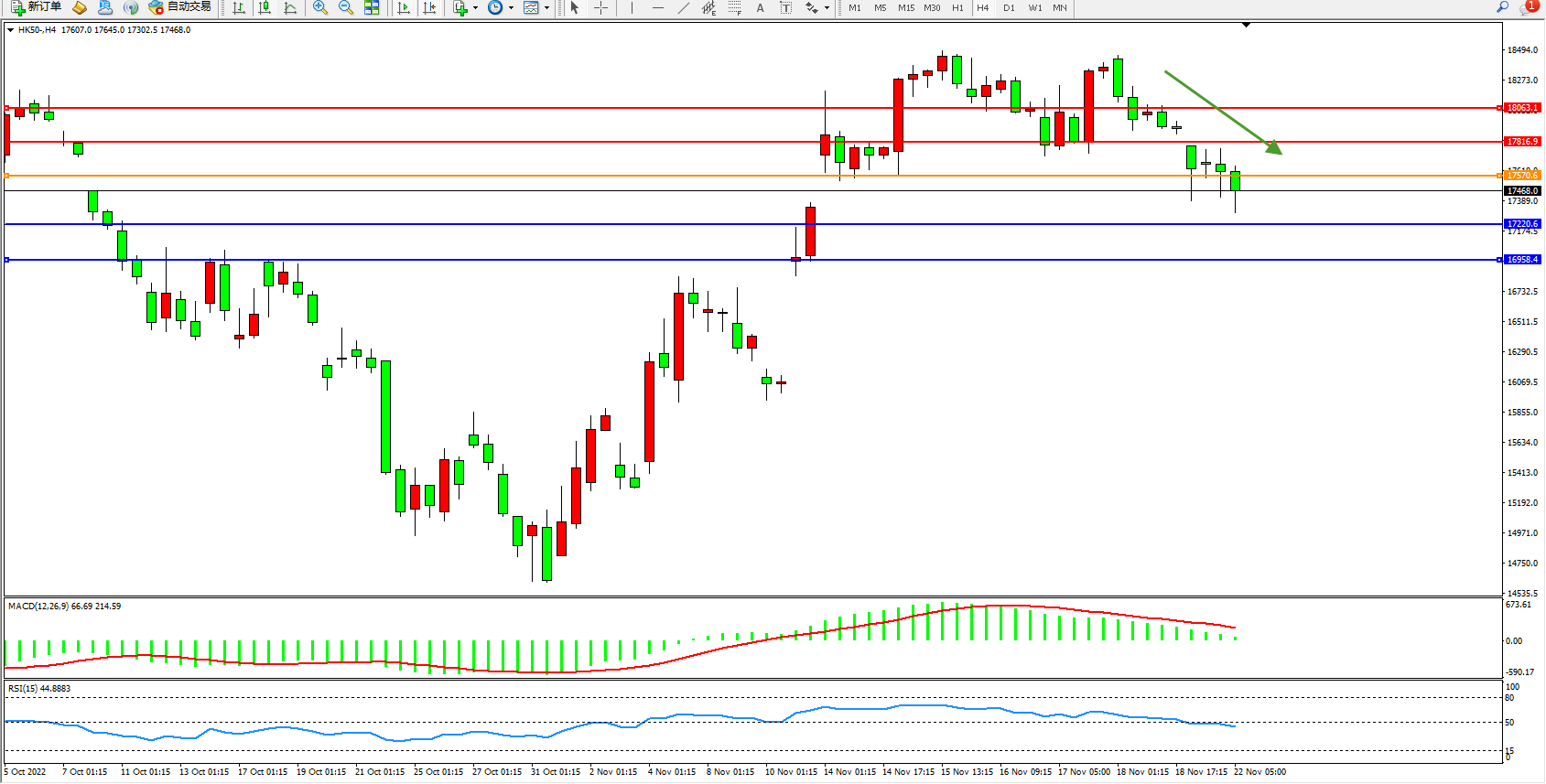 4小时图看:高位空头动力维持震荡下移,短期跌势或将延续,市场整体空头下移态势良好,MACD指标处于多头区域整理下移至0轴线附近徘徊,RSI指标处于50均衡线附近弱势下行;