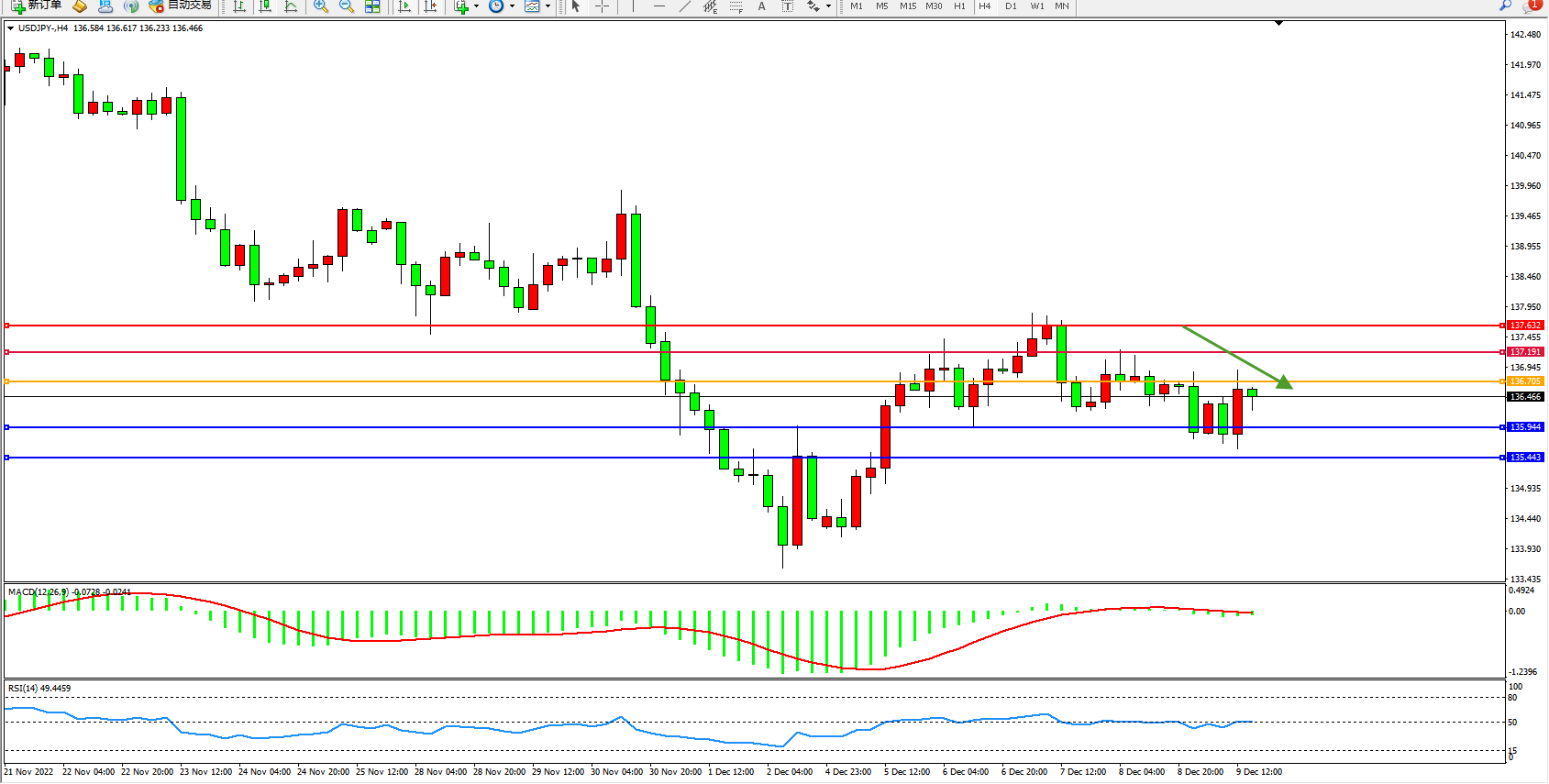 交易策略:136.705下方看跌,目标135.944、135.443
