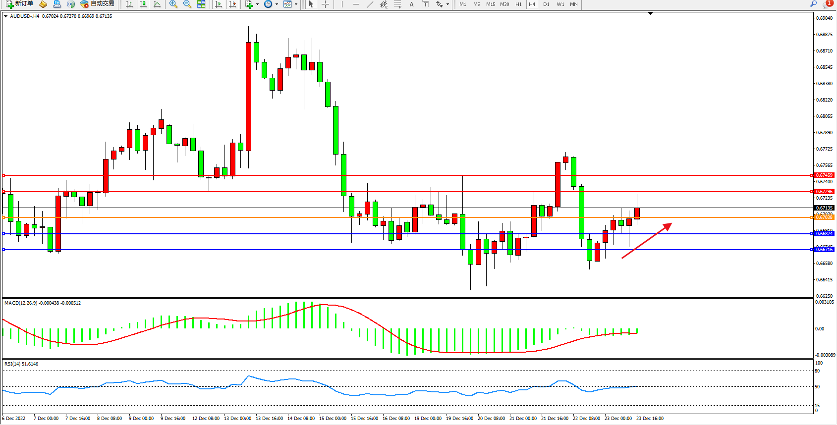 交易策略:0.67038上方看涨,目标0.67296、0.67459