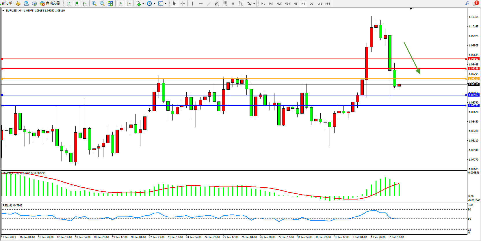 欧元美元EURUSD—4小时K线图显示: