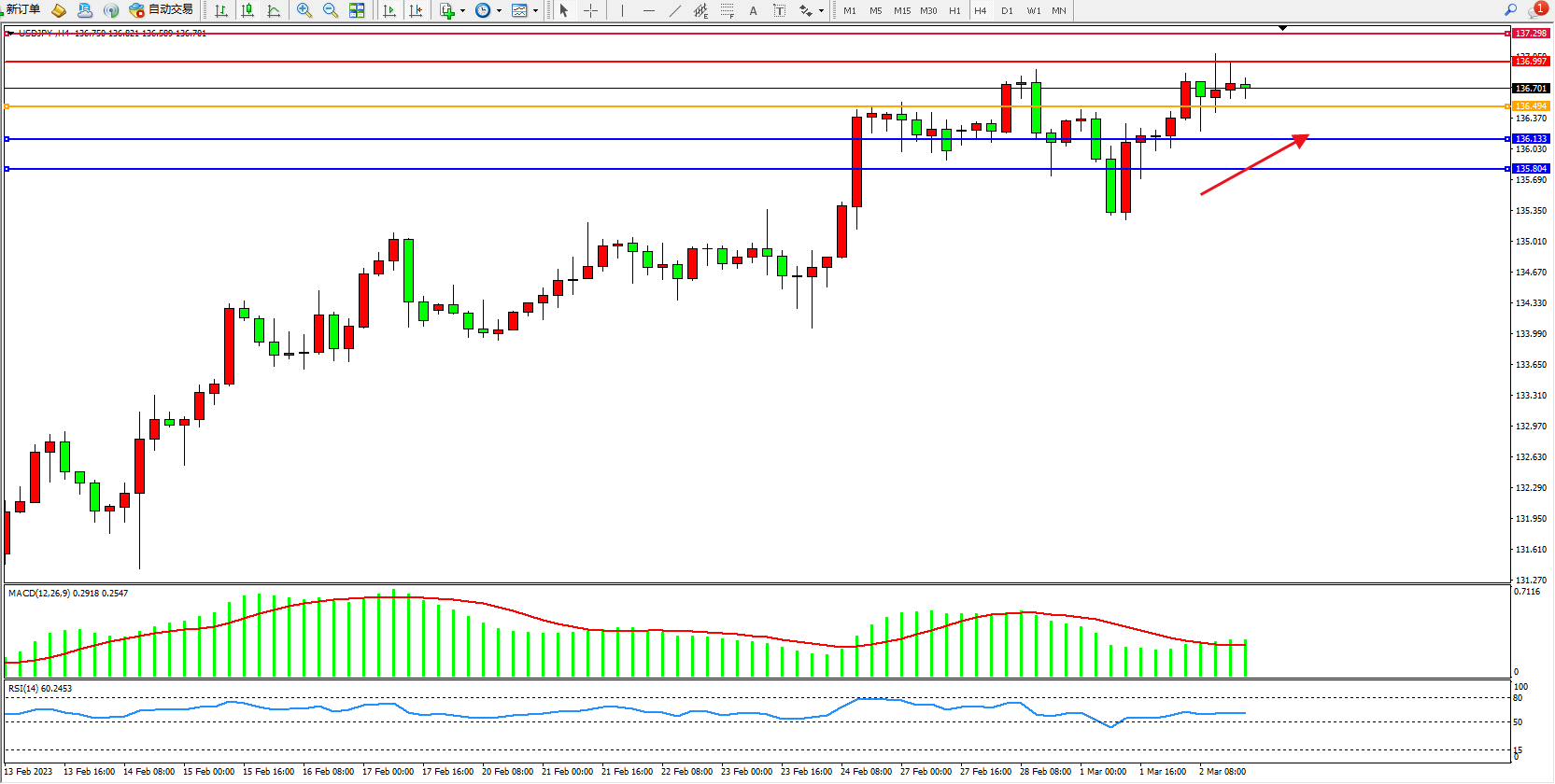 4小时图看:高位窄幅整理上移,市场看涨情绪依旧,短期有继续震荡向上移动态势,MACD指标处于多头区域维持整理,RSI指标处于50均衡线上側徘徊;