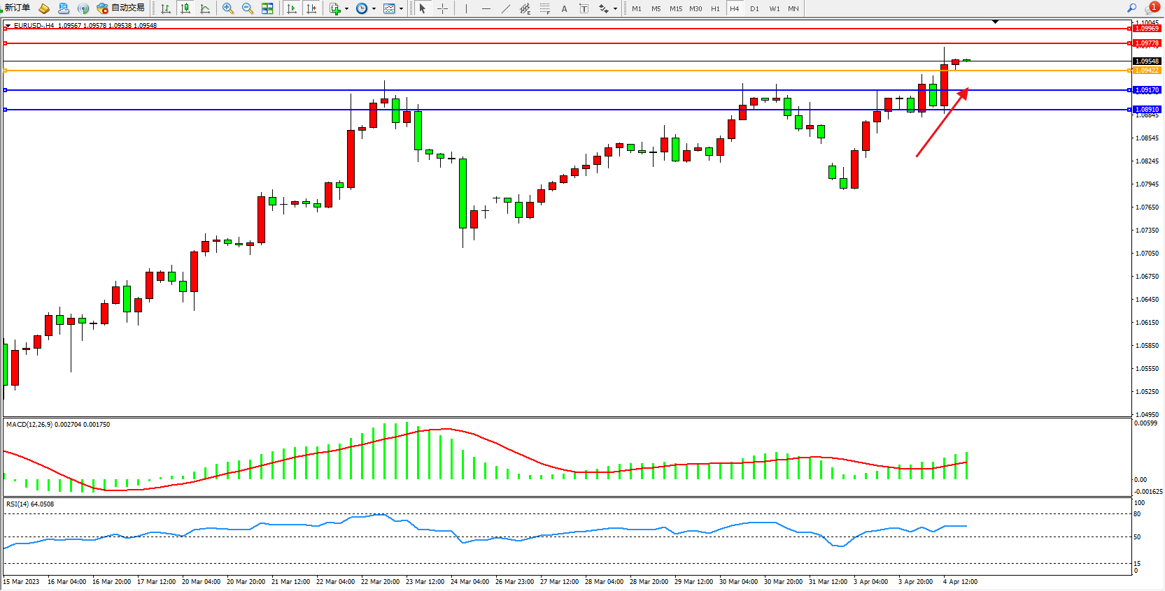欧元兑美元维持1.09548附近震荡,市场预计欧洲央行将继续以谨慎的速度加息,直到看到核心通胀出现好转。欧洲央行将在5月加息25个基点,并在今年春末和夏季继续以这种更为谨慎的步伐加息。