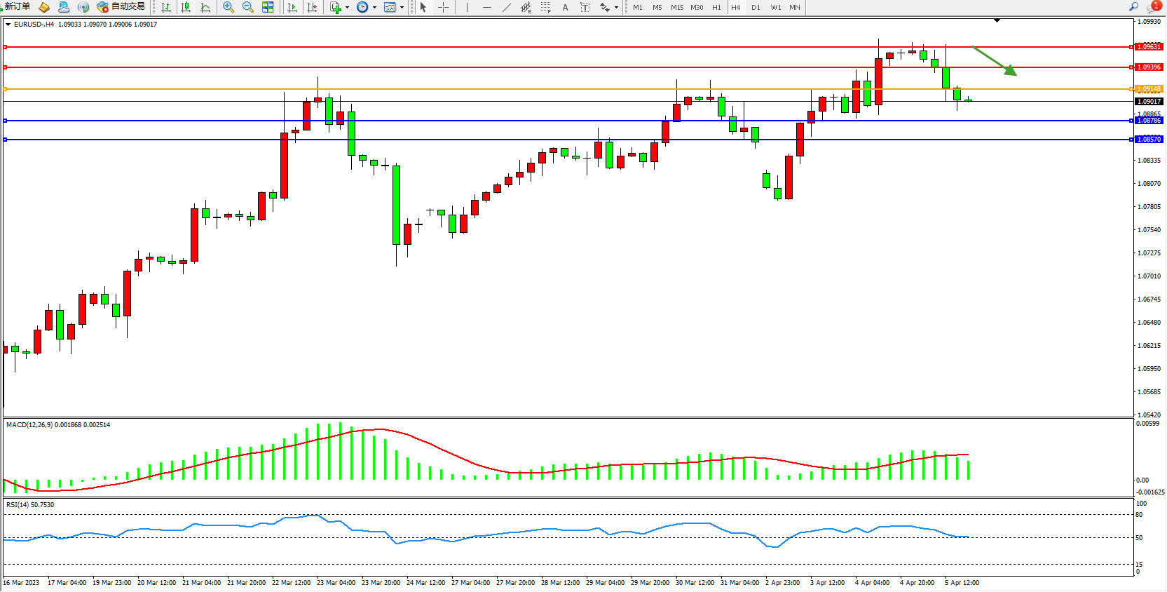 欧元美元EURUSD—4小时K线图显示: