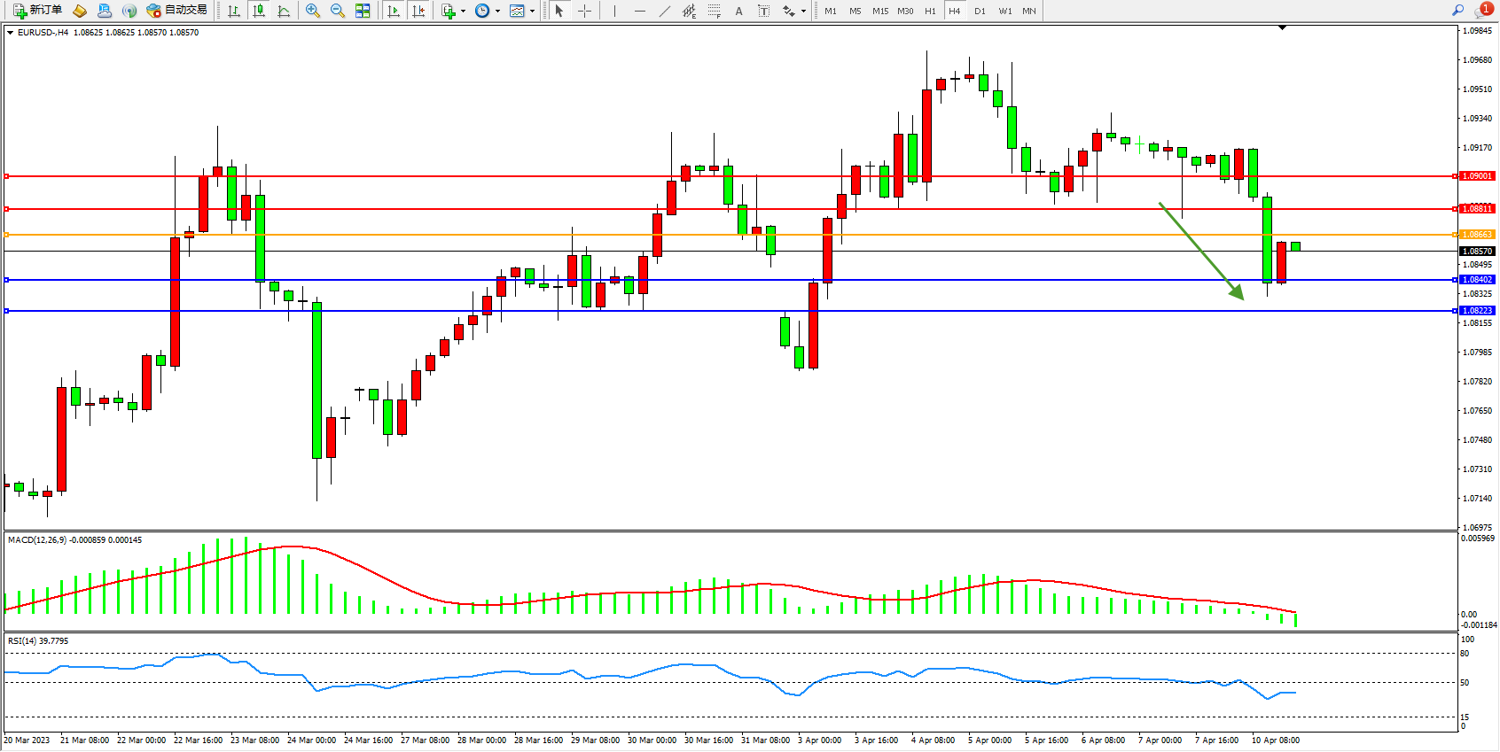 欧元美元EURUSD—4小时K线图显示:
