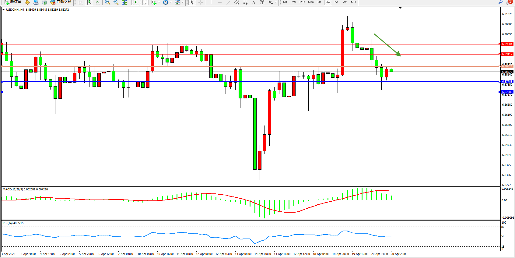 交易策略:6.88256下方看跌,目标6.87788 6.87286