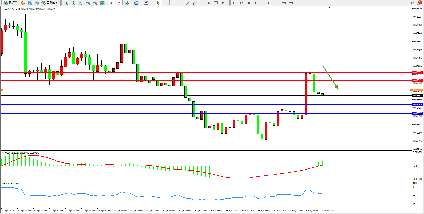 备选策略:0.66742上方看涨,目标0.66912  0.67052
