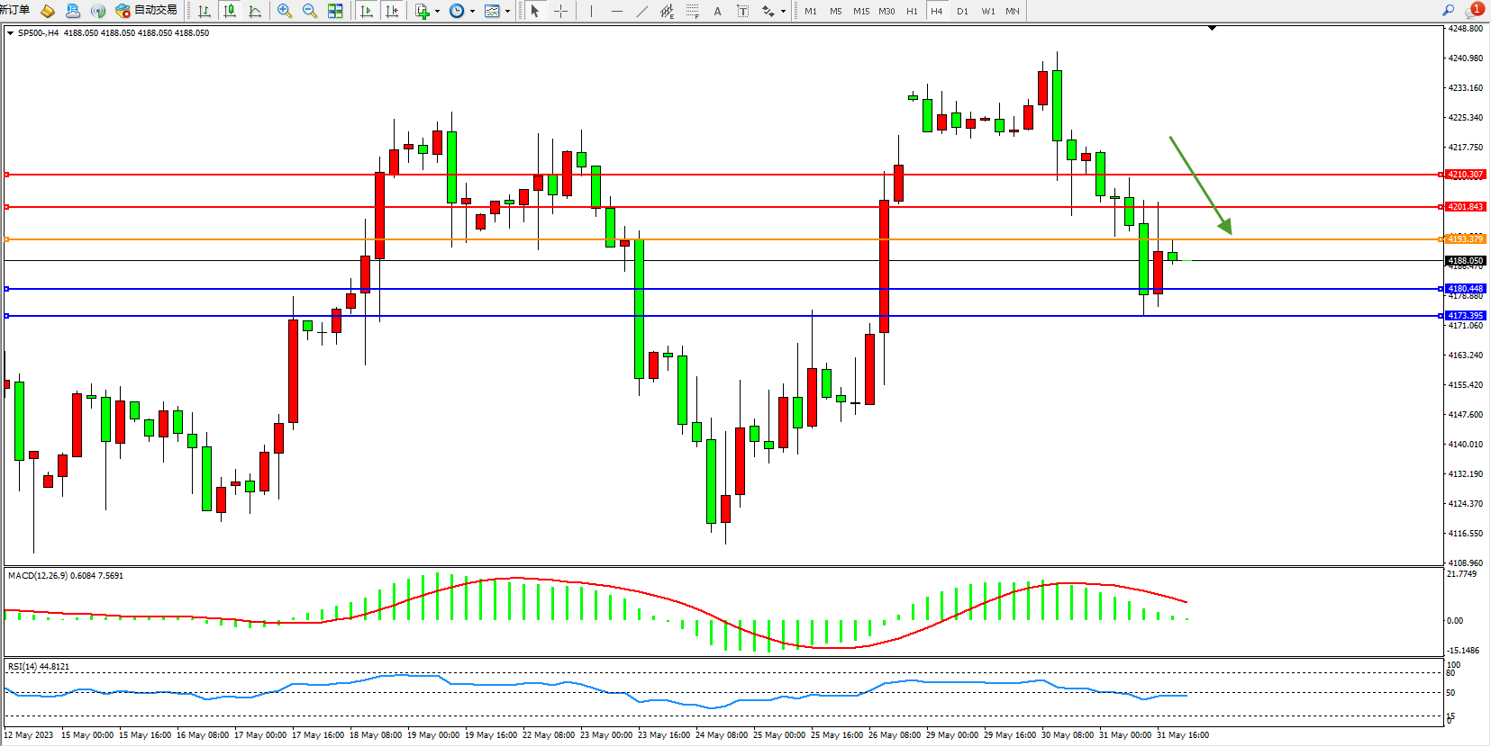标普500指数5月31日(周三)收盘下跌22.77点,跌幅0.54%,报4182.75点;由美国总统拜登和众议院议长凯文·麦卡锡促成的协议进入众议院全体会议进行辩论,预计将于周三投票通过。协议在众议院通过后将被送交参议院审表。协议需要在6月5日之前获得国会批准,否则美国届时可能会陷入史无前例的债务违约,进而引发美国乃至全球经济混乱。