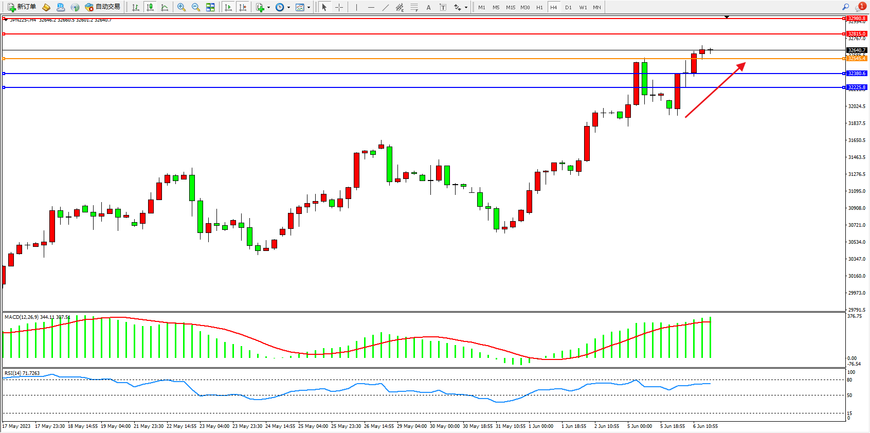 4小时图看:高位多头动力维持震荡向上移动,短期多头动力有继续向上移动态势,MACD指标处于多头区域高位上移,RSI指标处于多头区域高位整理;