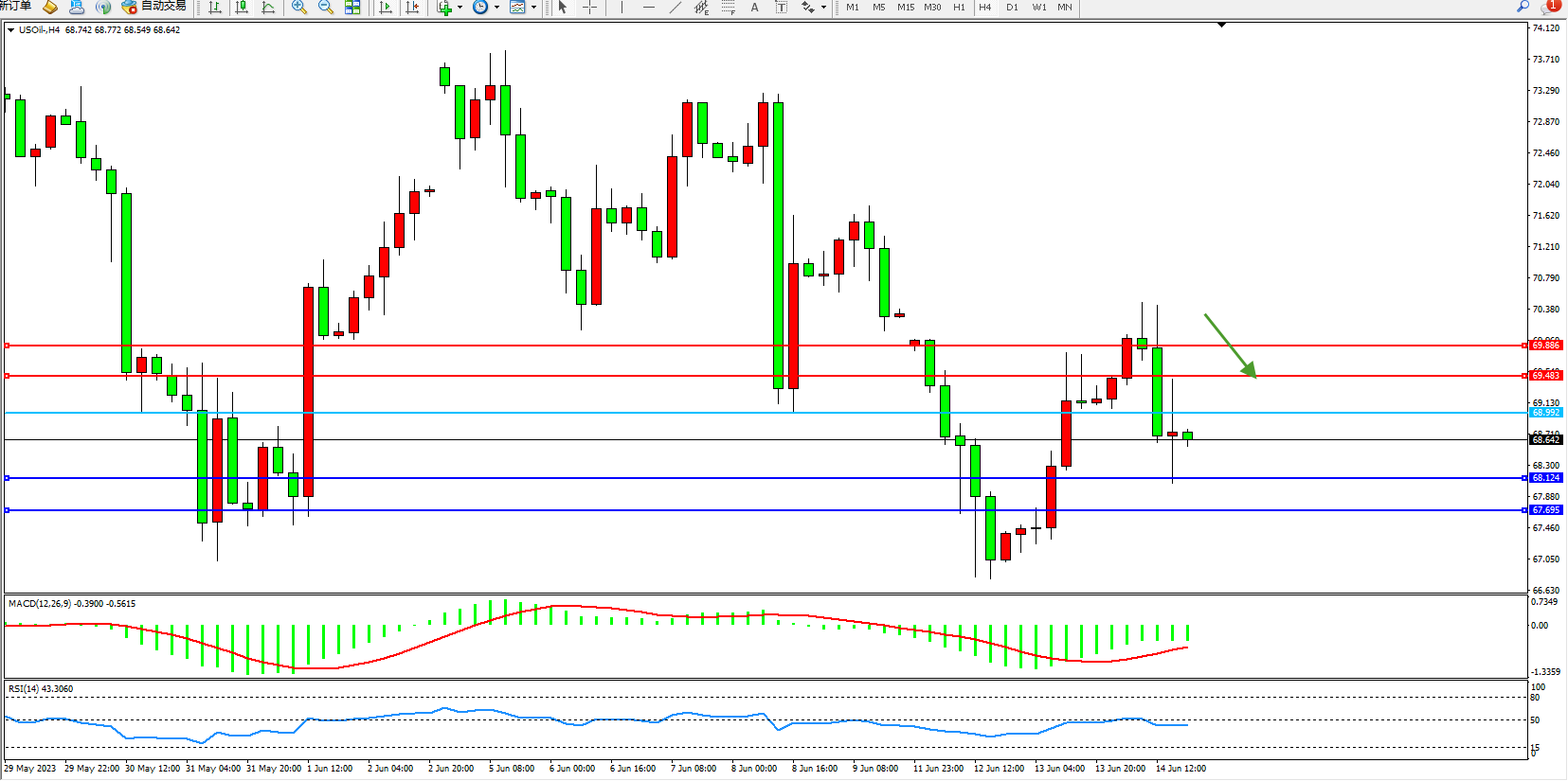 交易策略:68.992下方看跌,目标68.124  67.695