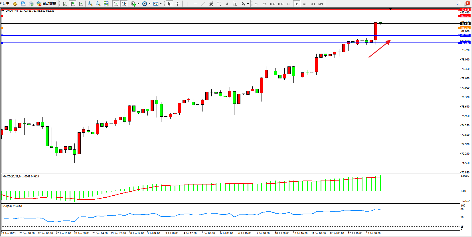 4小时图看:多头动力高位持续上行,市场看涨情绪笼罩,短期有继续攀升态势,MACD指标处于多头区域高位整理,RSI指标处于多头区域高位80均衡线附近徘徊;