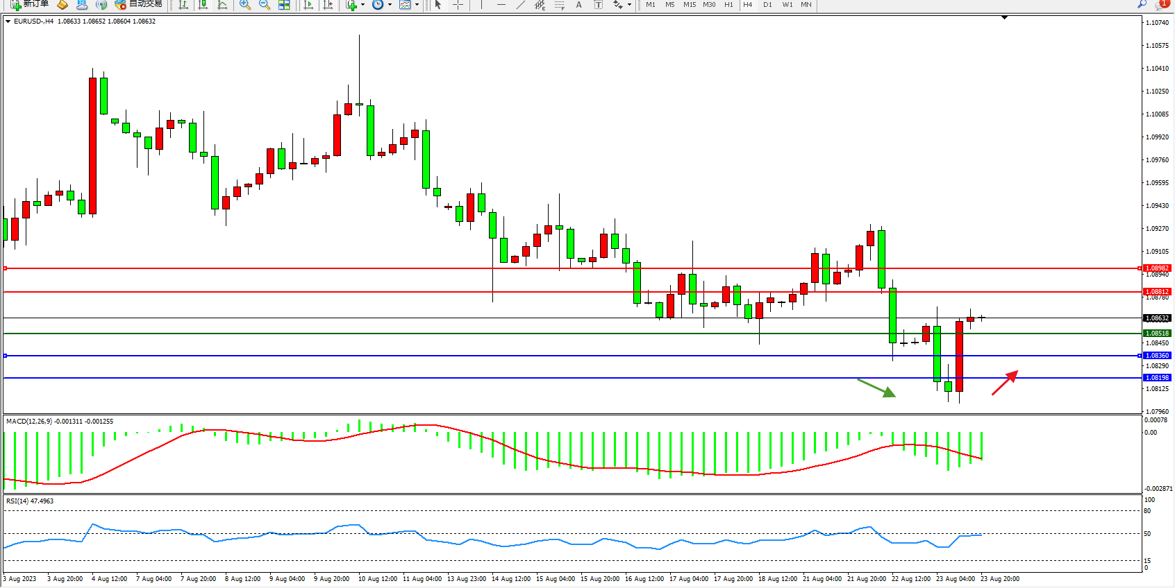 欧元美元EURUSD—4小时K线图显示: