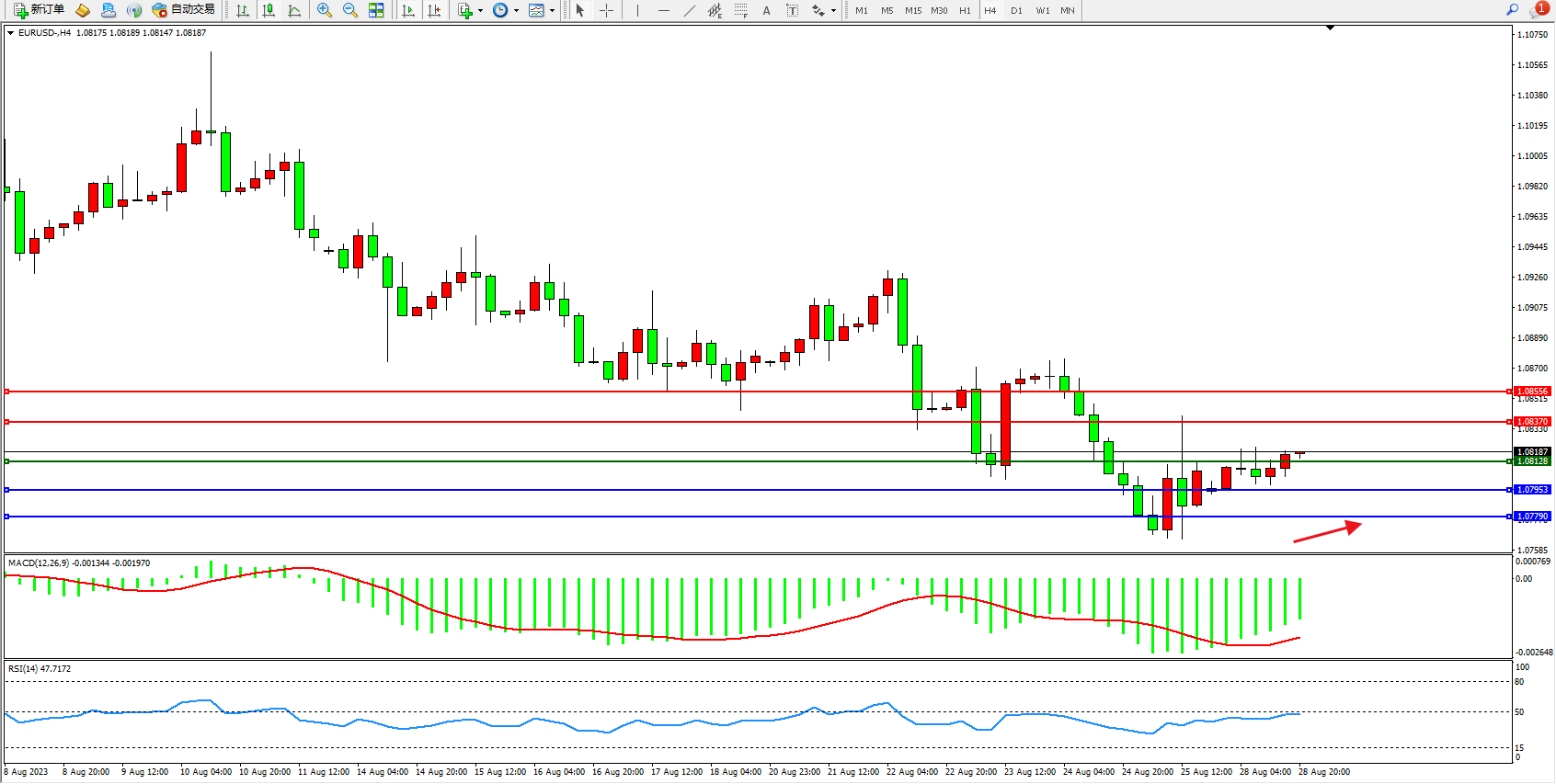 欧元美元EURUSD—4小时K线图显示: